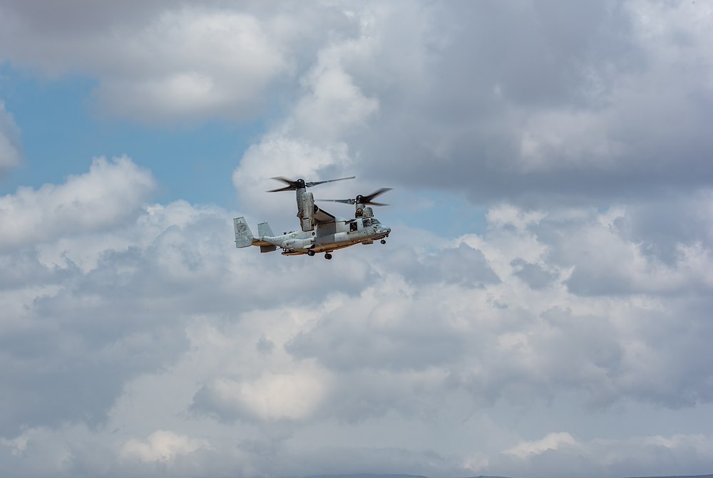 An MV-22 Osprey with Marine Medium Tiltrotor Squadron 161 (VMM-161) flies during a U.S. Personnel Recovery Coordination Center (PRCC) validation exercise at Grand Bara, Djibouti, Oct. 31, 2021. The PRCC, in support of Combined Joint Task Force - Horn of Africa (CJTF-HOA), conducts personnel recovery and casualty evacuation for U.S. and joint partners in East Africa. CJTF-HOA conducted a full casualty evacuation exercise working through all the phases of recovery and reintegration to test their personnel recovery and casualty evacuation system for deficiencies. (U.S. Air Force photo by Senior Airman Dwane R. Young)
