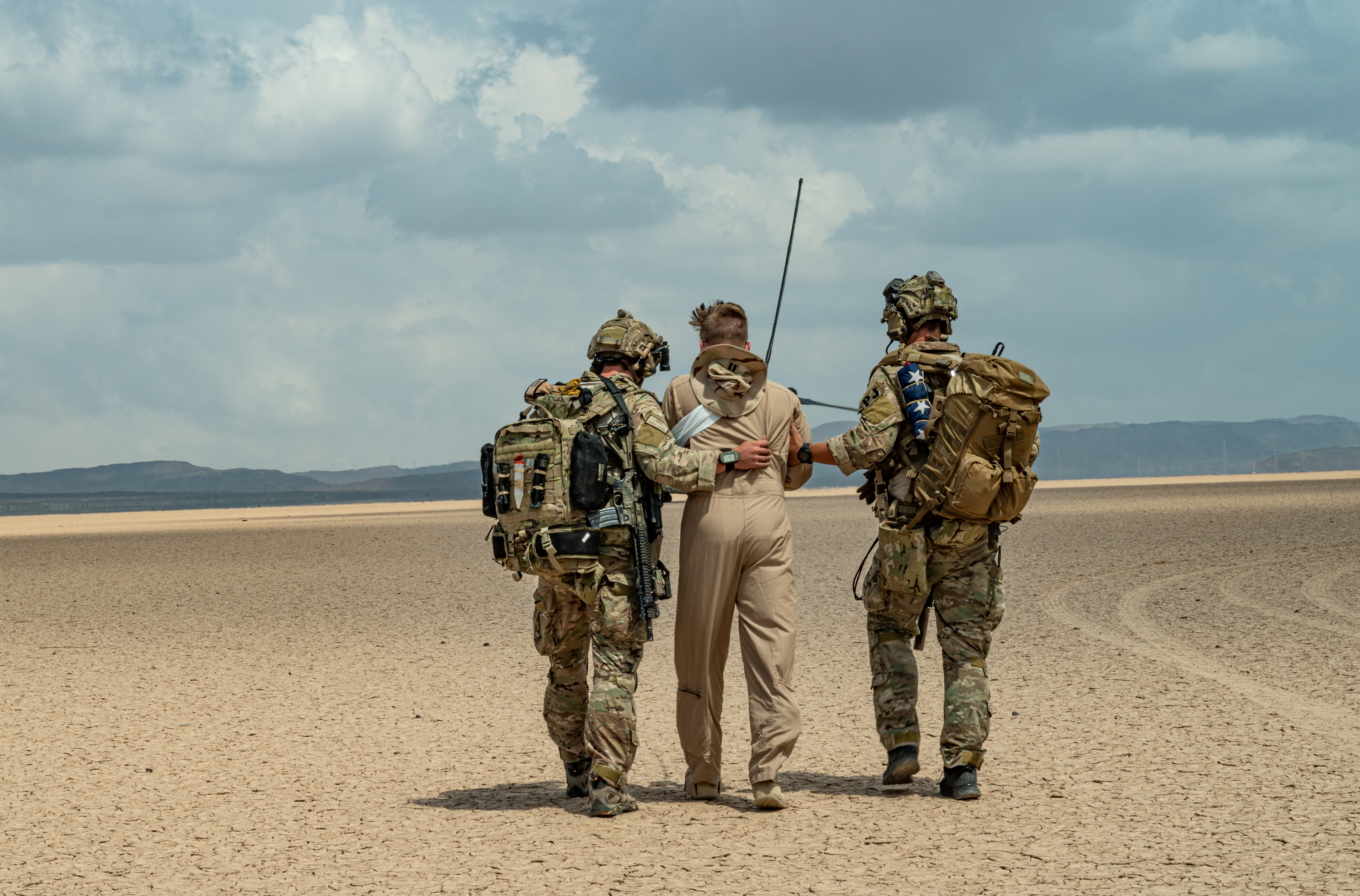 U.S. Air Force Airman Special Tactics Airmen with the 82nd Expeditionary Rescue Squadron recover a simulated downed pilot during a U.S. Personnel Recovery Coordination Center (PRCC) validation exercise at Grand Bara, Djibouti, Oct. 31, 2021. The PRCC, in support of Combined Joint Task Force - Horn of Africa (CJTF-HOA), conducts personnel recovery and casualty evacuation for U.S. and joint partners in East Africa. The exercise displayed PRCC’s capabilities and tested their personnel recovery and casualty evacuation system for deficiencies. (U.S. Air Force photo by Senior Airman Dwane R. Young)