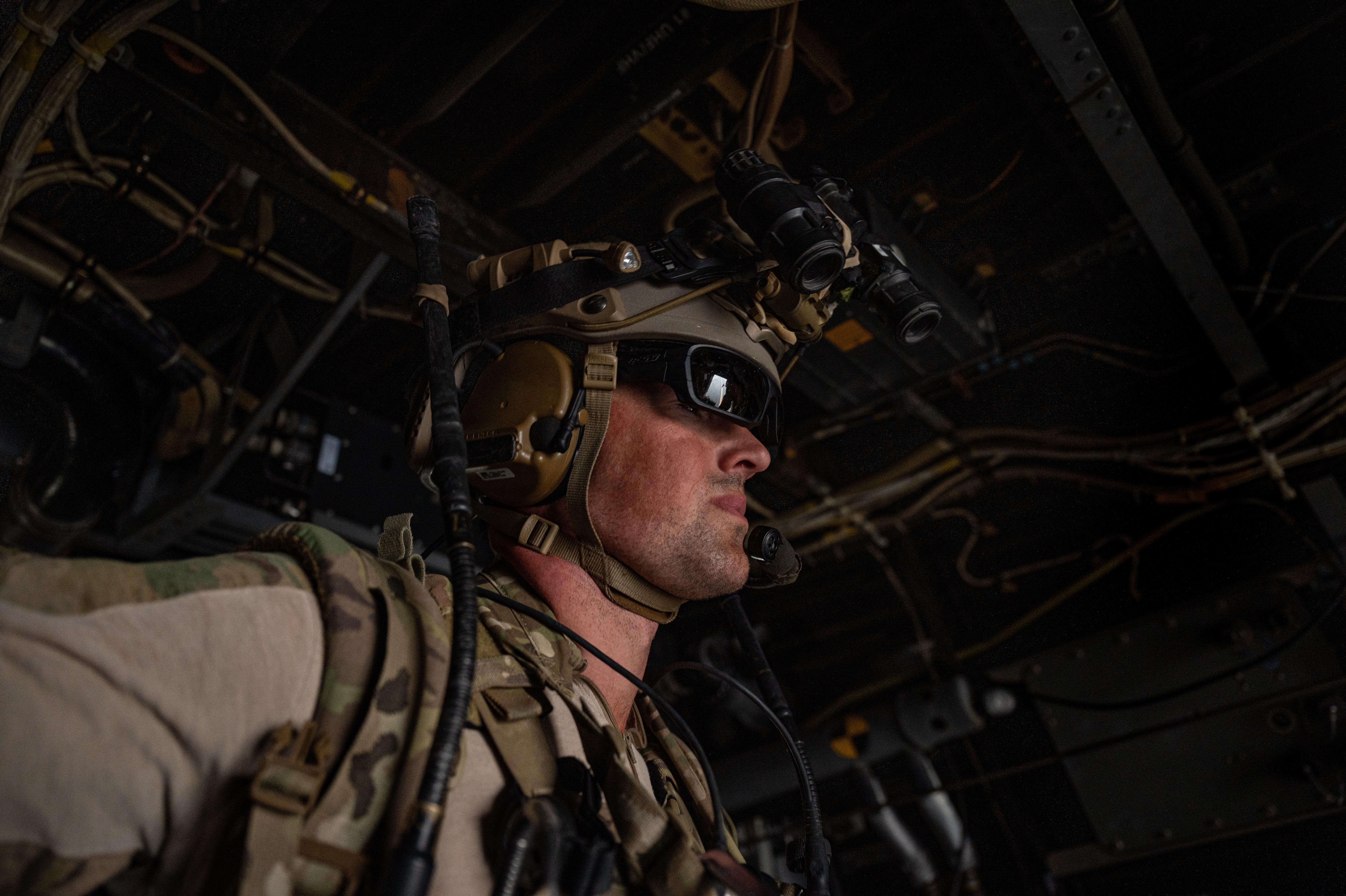 A U.S. Air Force Special Tactics Airman with the 82nd Expeditionary Rescue Squadron stands in a Marine Medium Tiltrotor Squadron 161 (VMM-161), MV-22 Osprey during a U.S. Personnel Recovery Coordination Center (PRCC) validation exercise at Grand Bara, Djibouti, Oct. 31, 2021. The PRCC, in support of Combined Joint Task Force - Horn of Africa (CJTF-HOA), conducts personnel recovery and casualty evacuation for U.S. and joint partners in East Africa. The exercise displayed PRCC’s capabilities and tested their personnel recovery and casualty evacuation system for deficiencies. (U.S. Air Force photo by Senior Airman Dwane R. Young)