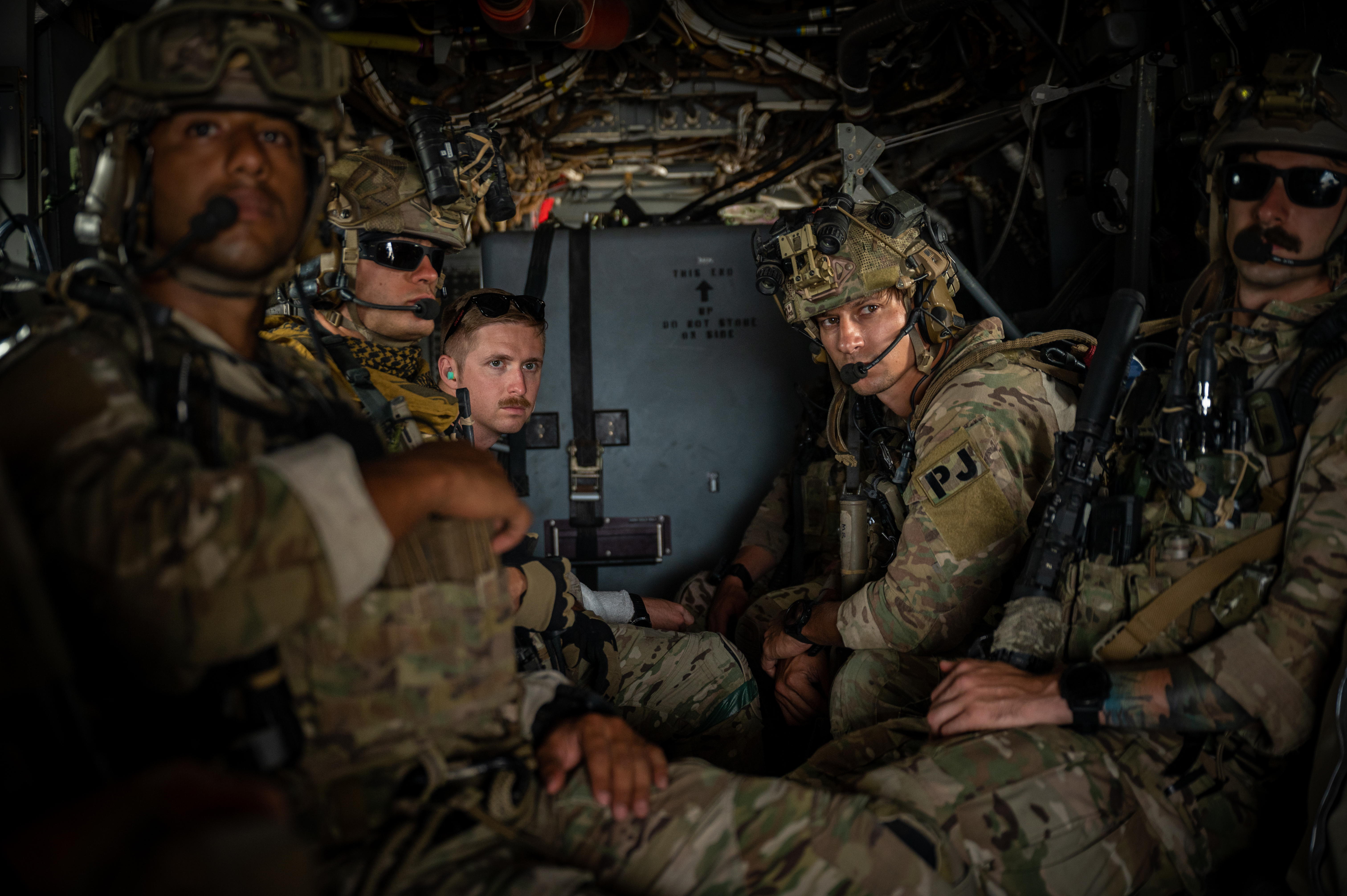 U.S. Air Force Special Tactics Airmen with the 82nd Expeditionary Rescue Squadron sit with a simulated rescued pilot in an MV-22 Osprey during a U.S. Personnel Recovery Coordination Center (PRCC) validation exercise at Grand Bara, Djibouti, Oct. 31, 2021. The PRCC, in support of Combined Joint Task Force - Horn of Africa (CJTF-HOA) conducts personnel recovery and casualty evacuation for U.S. and joint partners in East Africa. The exercise displayed PRCC’s capabilities and tested their personnel recovery and casualty evacuation system for deficiencies. (U.S. Air Force photo by Senior Airman Dwane R. Young)