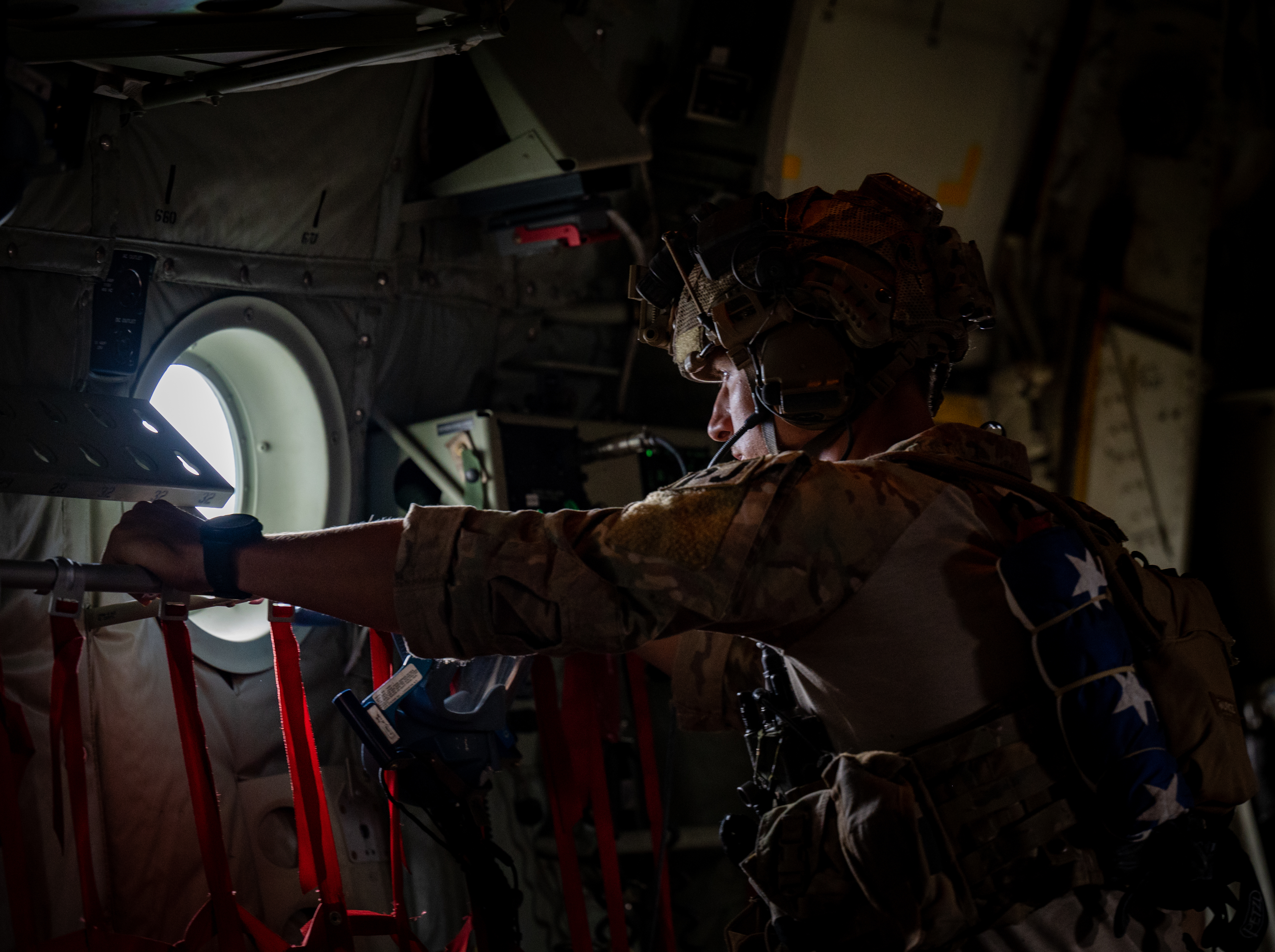 A U.S. Air Force Special Tactics Airmen with the 82nd Expeditionary Rescue Squadron looks out of a window of a KC-130J Super Hercules with Marine Aerial Refueler Transport Squadron 352 (VMGR-352), during a U.S. Personnel Recovery Coordination Center (PRCC) validation exercise over Camp Lemonnier, Djibouti, Oct. 31, 2021. The KC-130J flight simulated the ability of PRCC assets to transfer recovered personnel overseas to higher levels of care. The PRCC, in support of Combined Joint Task Force - Horn of Africa (CJTF-HOA), conducts personnel recovery and casualty evacuation for U.S. and joint partners in East Africa. The exercise displayed PRCC’s capabilities and tested their personnel recovery and casualty evacuation system for deficiencies. (U.S. Air Force photo by Senior Airman Dwane R. Young)