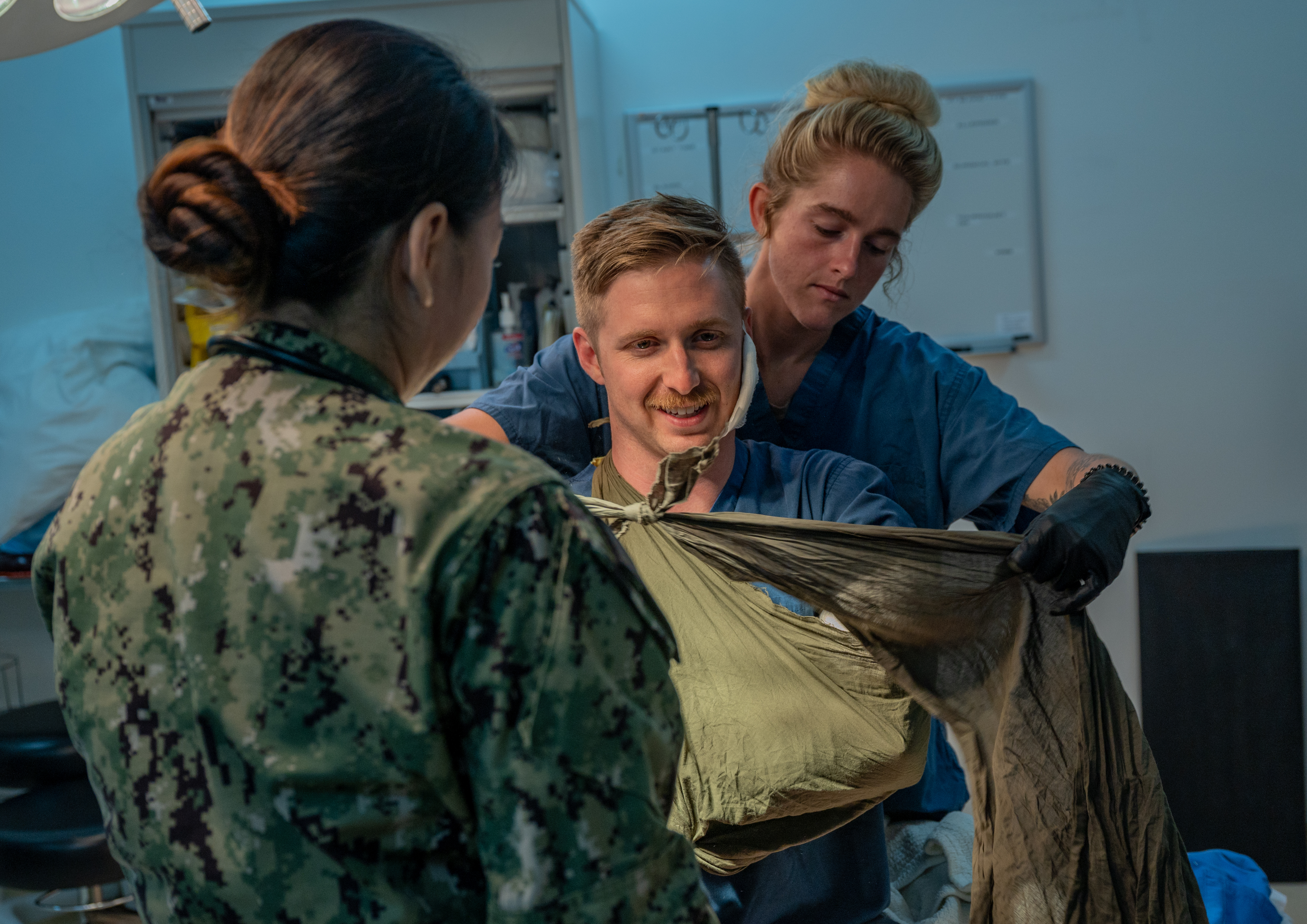 Lt. Lucy Sho, Camp Lemonnier Expeditionary Medical Facility (EMF) flight surgeon, and Lt. j.g. Katelyn Morton, EMF nurse, treats injuries of Capt. Hans Kollar, 449th Air Expeditionary Group chief of safety during a U.S. Personnel Recovery Coordination Center (PRCC) validation exercise at Camp Lemonnier, Djibouti, Oct. 31, 2021. EMF members provided higher-level medical care to Kollar who simulated a recovered downed pilot for the exercise. The PRCC, in support of Combined Joint Task Force - Horn of Africa (CJTF-HOA), conducts personnel recovery and casualty evacuation for U.S. and joint partners in East Africa. The exercise displayed PRCC’s capabilities and tested their personnel recovery and casualty evacuation system for deficiencies. (U.S. Air Force photo by Senior Airman Dwane R. Young)