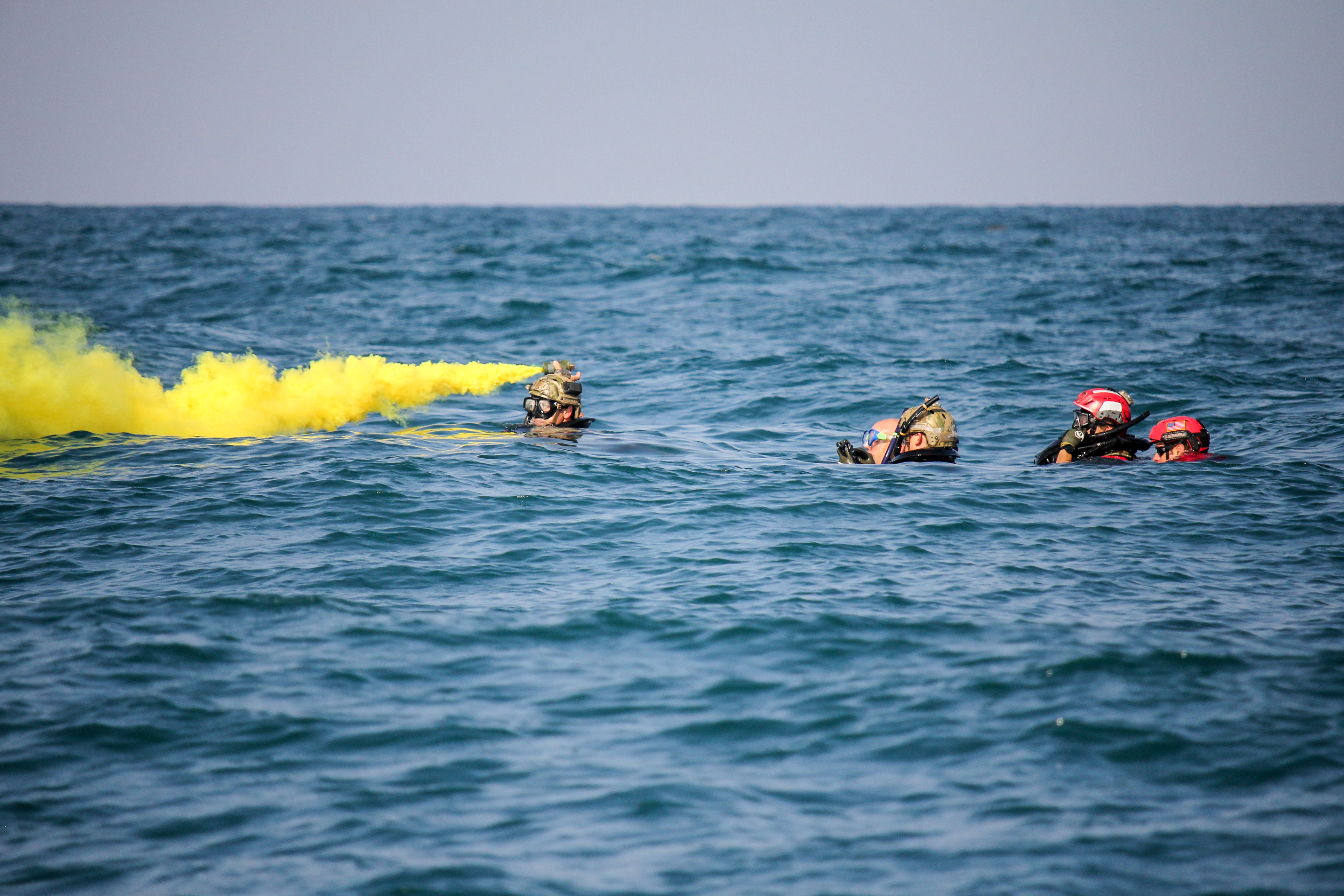 A U.S. Air Force pararescueman, assigned to the 82nd Expeditionary Rescue Squadron signals a Spanish AB-212 helicopter for extraction during Exercise Bull Shark over the Gulf of Aden near Djibouti, Dec. 3, 2021. Exercise Bull Shark was a combined training between U.S. and Spanish Forces to strengthen personnel recovery capabilities in support of the Warfighter Recovery Network initiative throughout Africa. (Photo by U.S. Air Force Tech. Sgt. Jeffrey Jordan)