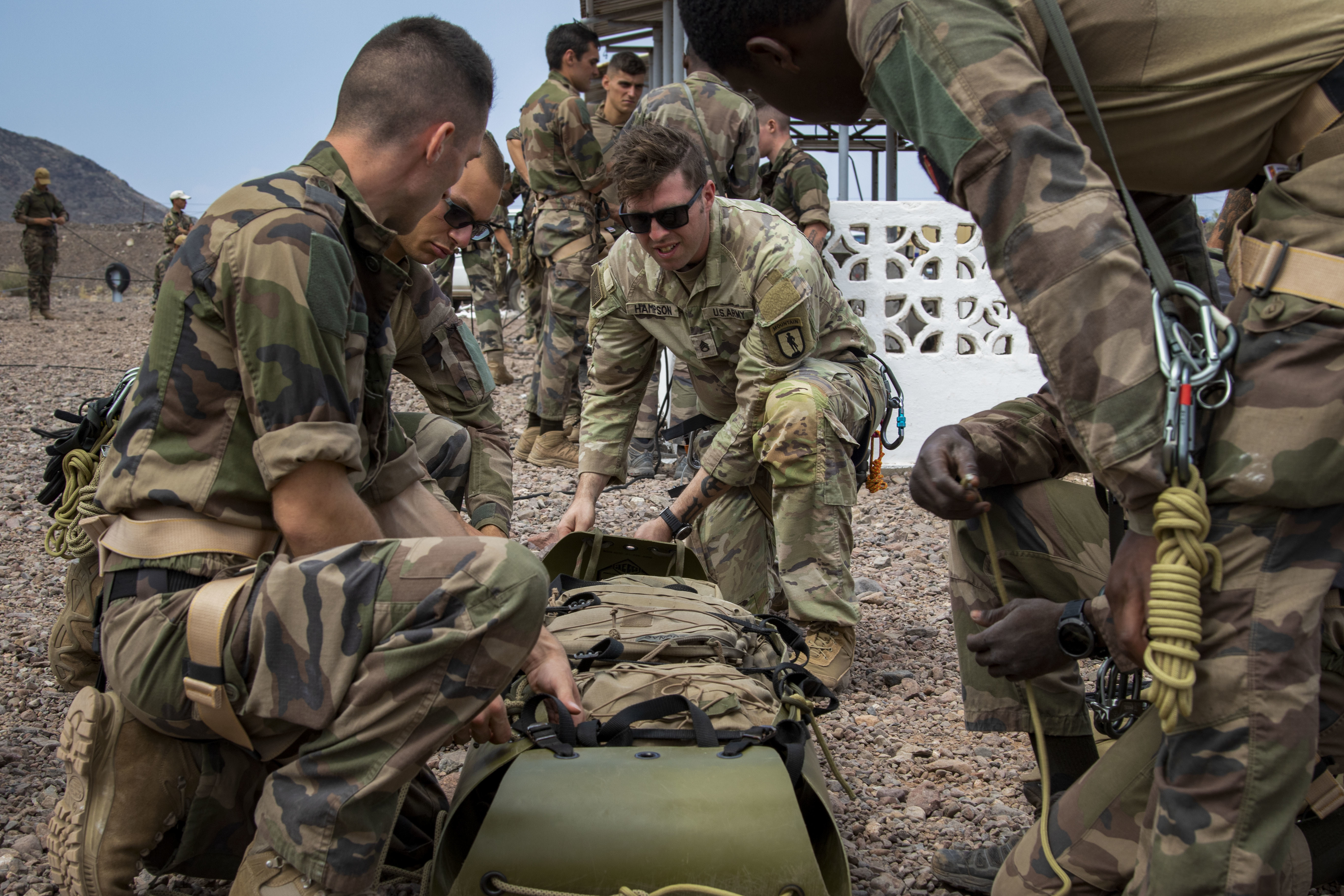 U.S. Army Staff Sgt. John Hampson, an instructor at the U.S. Army Mountain Warfare School, instructs French service members with the 5th Overseas Interarms Regiment (5e RIAOM) on casualty evacuation techniques at the French Combat Training Center at Arta Beach, Djibouti, Dec. 14, 2021. Five instructors from the U.S. Army Mountain Warfare School in Jericho, Vt. taught a five-day Joint Expeditionary Mountain Warfare Course on basic military mountaineering skills to French service members in Djibouti to strengthen the relationships among the international forces working together in the region. (U.S. Army Photo by Staff Sgt. Amanda Stock)