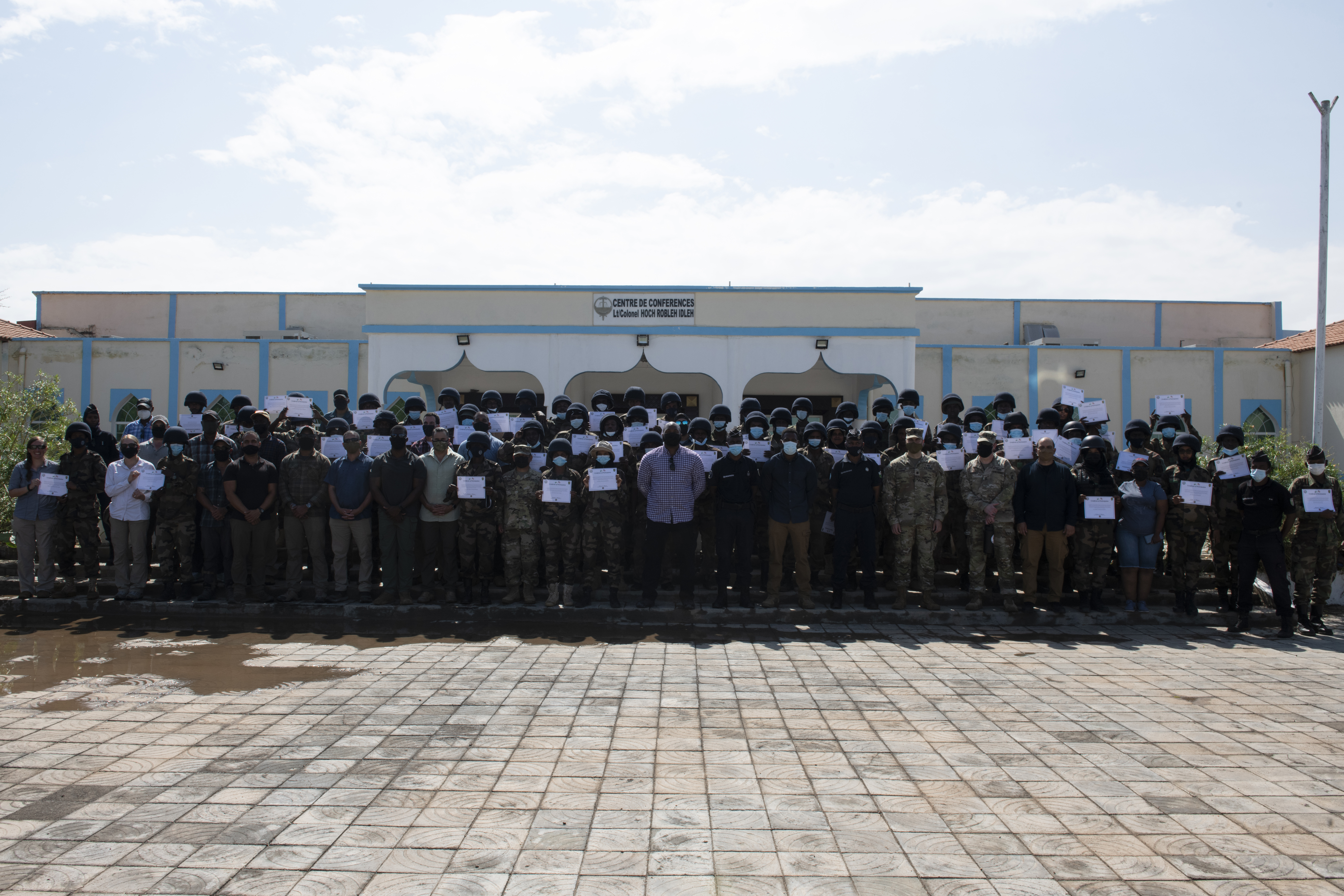 Members of the Djiboutian Gendarmerie are pictured with U.S. service members from Combined Joint Task Force-Horn of Africa following a medical knowledge exchange at the Gendarmerie compound in Djibouti City, Djibouti, Jan. 17, 2022. Civil Affairs Soldiers from Combined Joint Task Force – Horn of Africa partnered with the Gendarmeries at their mobile unit for a four-day event which allowed both parties to share their medical practices and tactics through educational comparisons and hands-on practical application. CJTF-HOA, operating from Camp Lemonnier, Djibouti, regularly trains with and works alongside allied and partner nations, coalition forces and interagency/intergovernmental organizations to achieve a unified effort in East Africa. (U.S. Air Force photo by Tech. Sgt. Lynette M. Rolen)