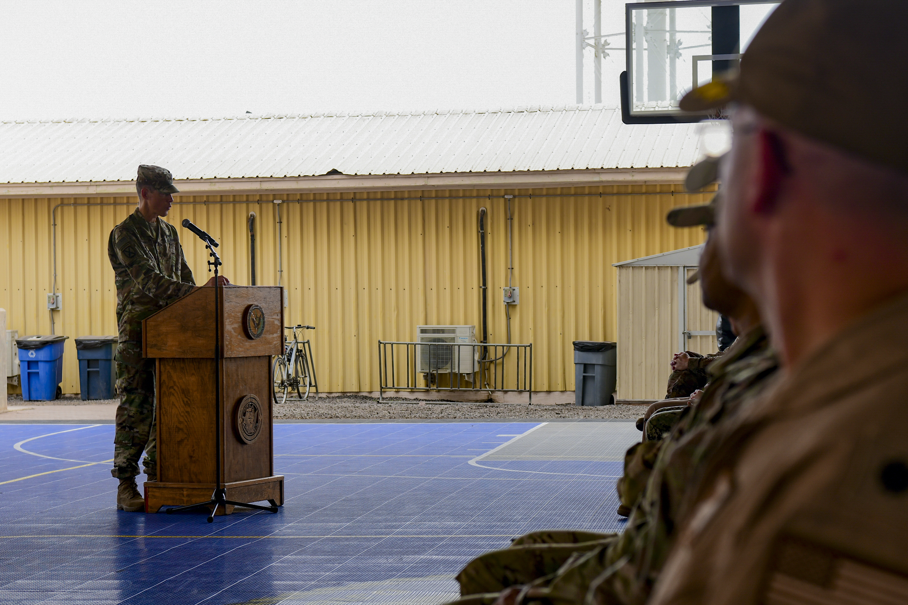 U.S. Army Maj. Gen. William L. Zana, commanding general of Combined Joint Task Force - Horn of Africa (CJTF-HOA), provides remarks during a transfer of authority ceremony at Camp Lemonnier, Djibouti, Feb. 26, 2022. Soldiers from the Nebraska Army National Guard’s 67th Maneuver Enhancement Brigade (MEB) transferred authority of the CJTF-HOA mission over to the Illinois Army National Guard’s 404th MEB. (U.S. Air Force photo by Senior Airman Blake Wiles)