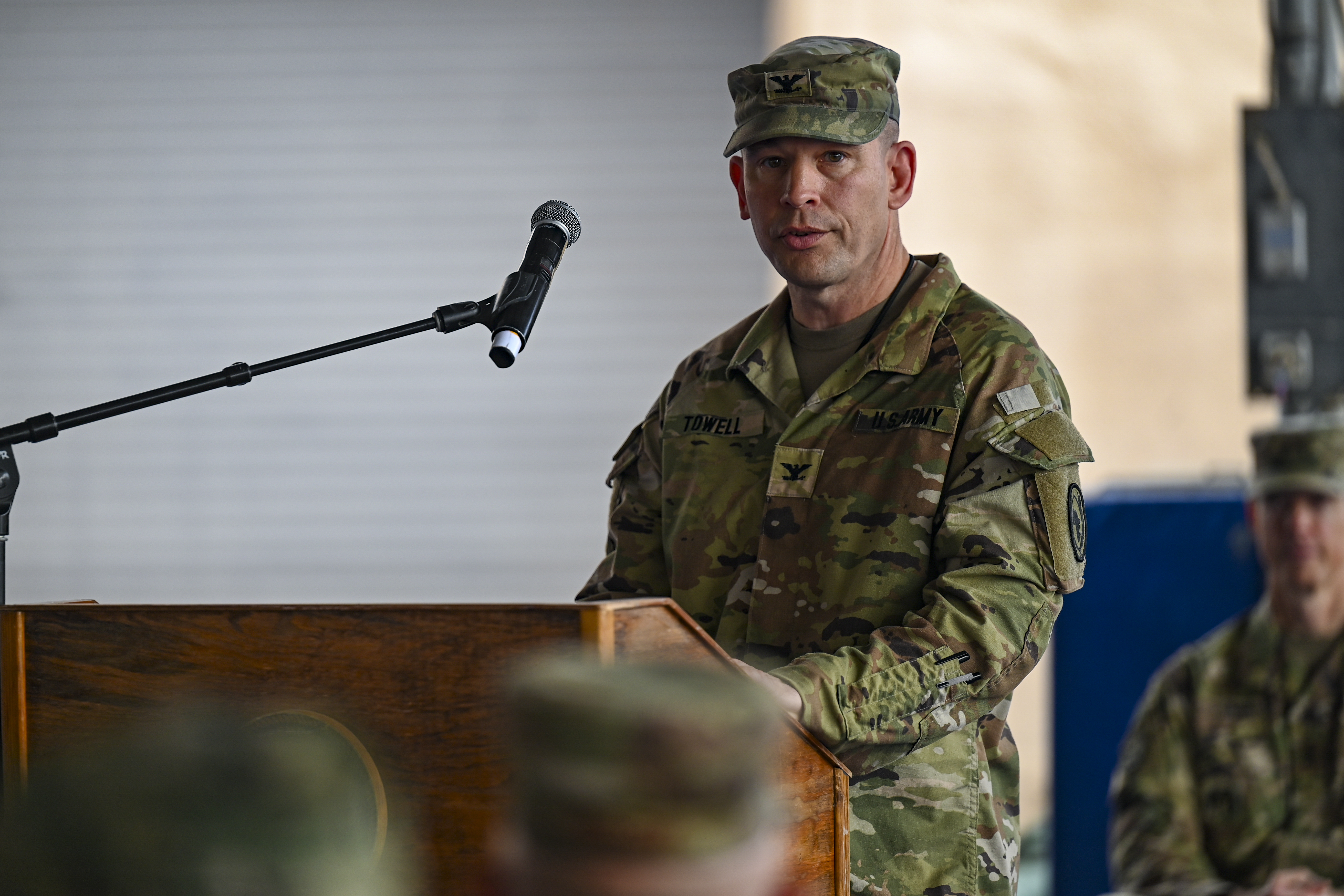 U.S. Army Col. Justin Towell, incoming chief of staff of Combined Joint Task Force – Horn of Africa, provides remarks during a transfer of authority ceremony at Camp Lemonnier, Djibouti, Feb. 26, 2022. As chief of staff, Towell will lead the 404th Maneuver Enhancement Brigade to improve relationships with partner nations through supporting security, mobility and functional operations of forces throughout the Horn of Africa. (U.S. Air Force photo by Senior Airman Blake Wiles)