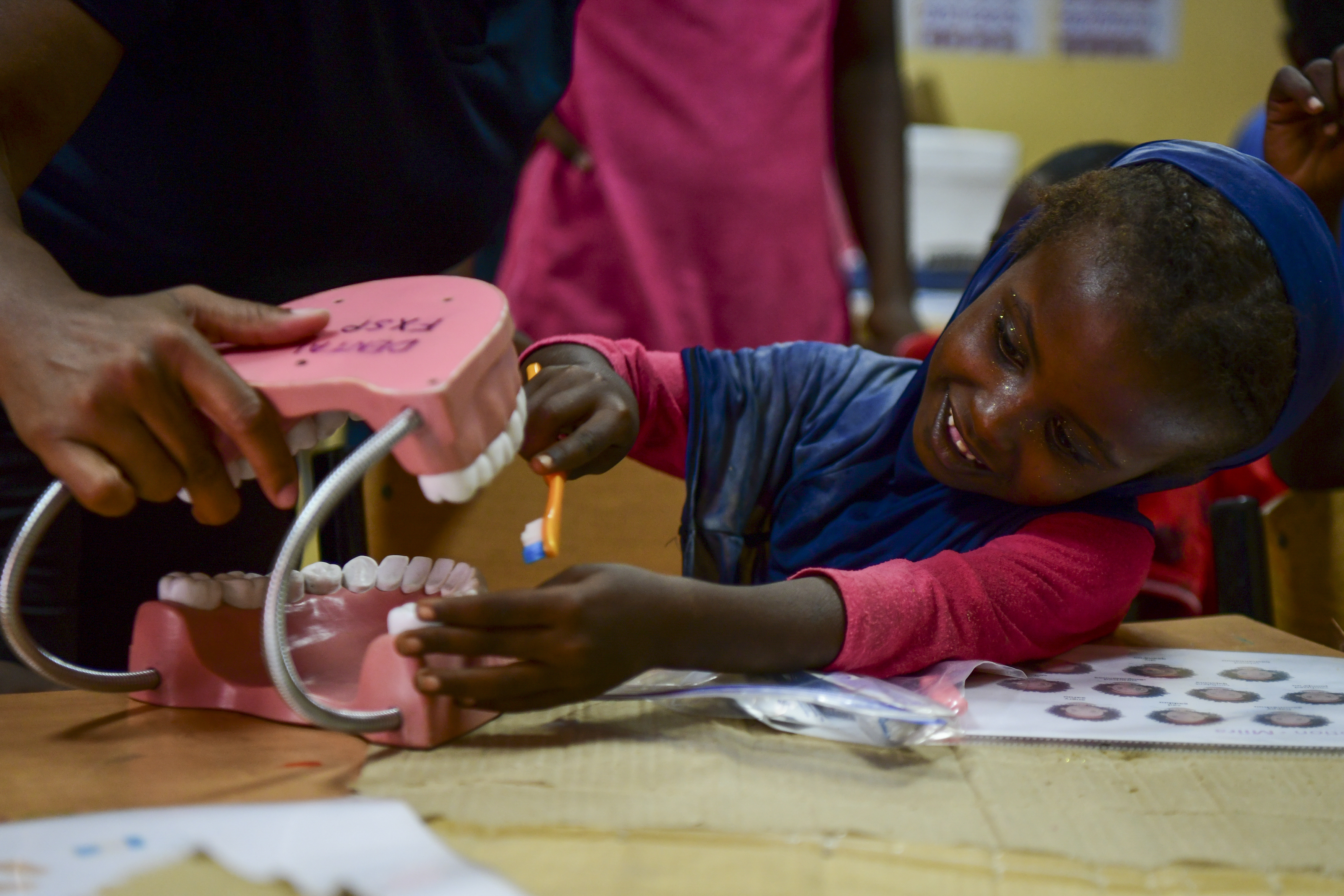 A child practices teeth brushing at Caritas Orphanage, Djibouti, March 7, 2022. U.S. Army Soldiers with 403rd Civil Affairs Battalion (Airborne) and U.S. Marines with the Marine Medium Tiltrotor Squadron 161 (VMM-161) volunteered to teach children oral hygiene basics at the orphanage. Members with the 403rd CAB support Combined Joint Task Force – Horn of Africa by specializing in strengthening partnerships throughout East Africa. The 403rd CAB offers the oral hygiene class weekly and helps between 60-185 children per class. (U.S. Air Force photo by Senior Airman Blake Wiles)