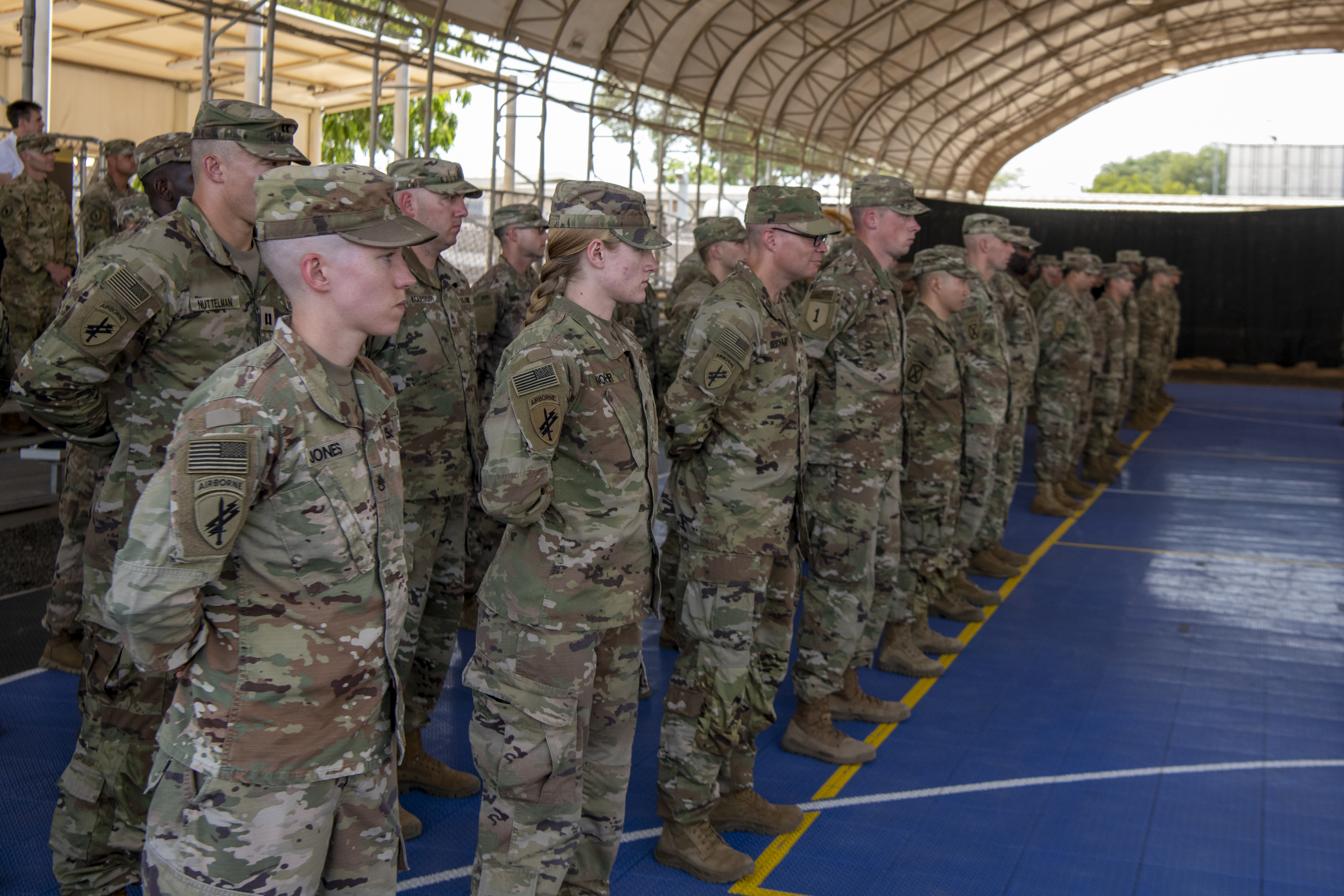 Soldiers with the 411th Civil Affairs Battalion (CAB) stand in formation during a transfer of responsibility ceremony at Camp Lemonnier, Djibouti, April 15, 2022. In support of U.S. Africa Command and Combined Joint Task Force – Horn of Africa, the 411th CAB now has responsibility for two civil affairs companies: Civil Affairs West Africa and Civil Affairs East Africa. (U.S. Air Force photo by Senior Airman Blake Wiles)
