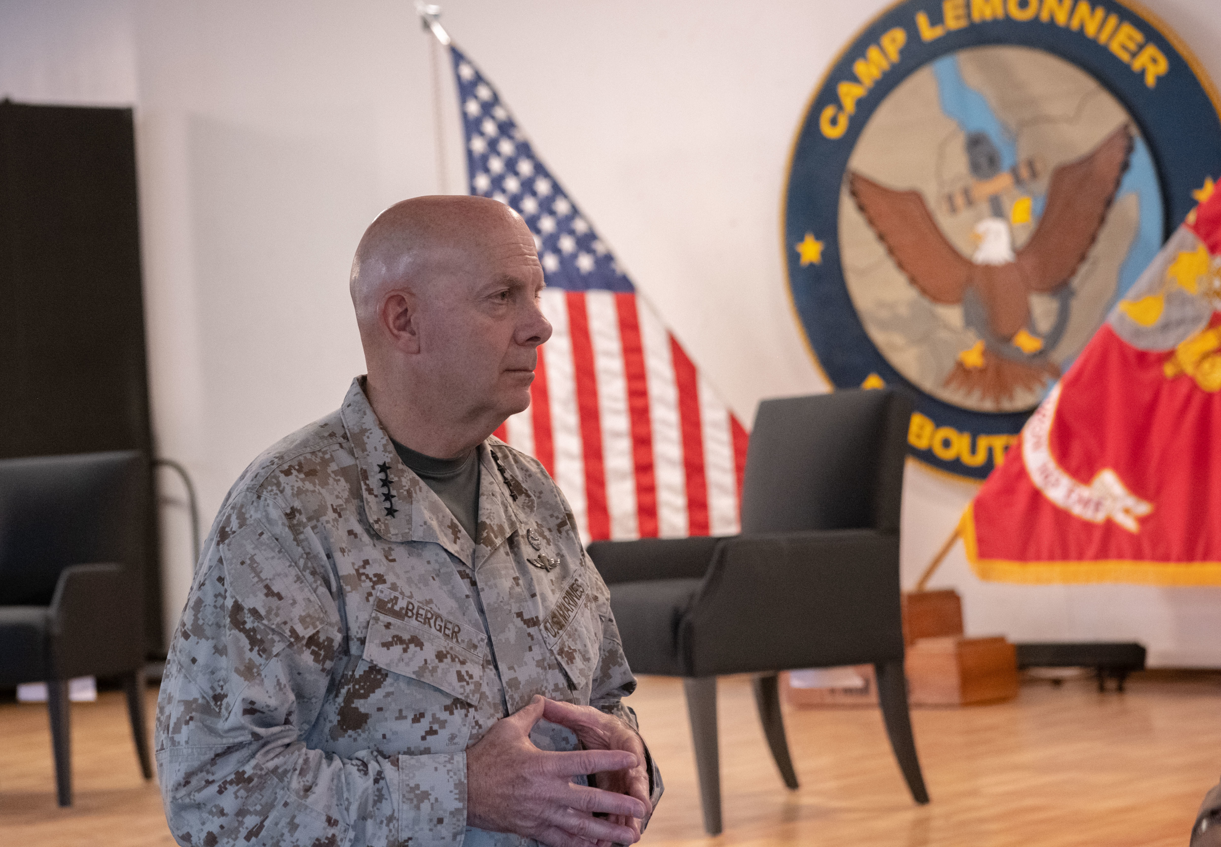 U.S. Marine Corps Gen. David H. Berger, 38th Commandant of the Marine Corps, speaks at a town hall held during his visit to Camp Lemonnier, Djibouti, Aug. 10, 2022. Gen. Berger spent his time learning about the different Combined Joint Task Force - Horn of Africa (CJTF-HOA) missions, and speaking to Marines. (U.S. Air Force photo by Staff Sgt. Dallin Wrye)