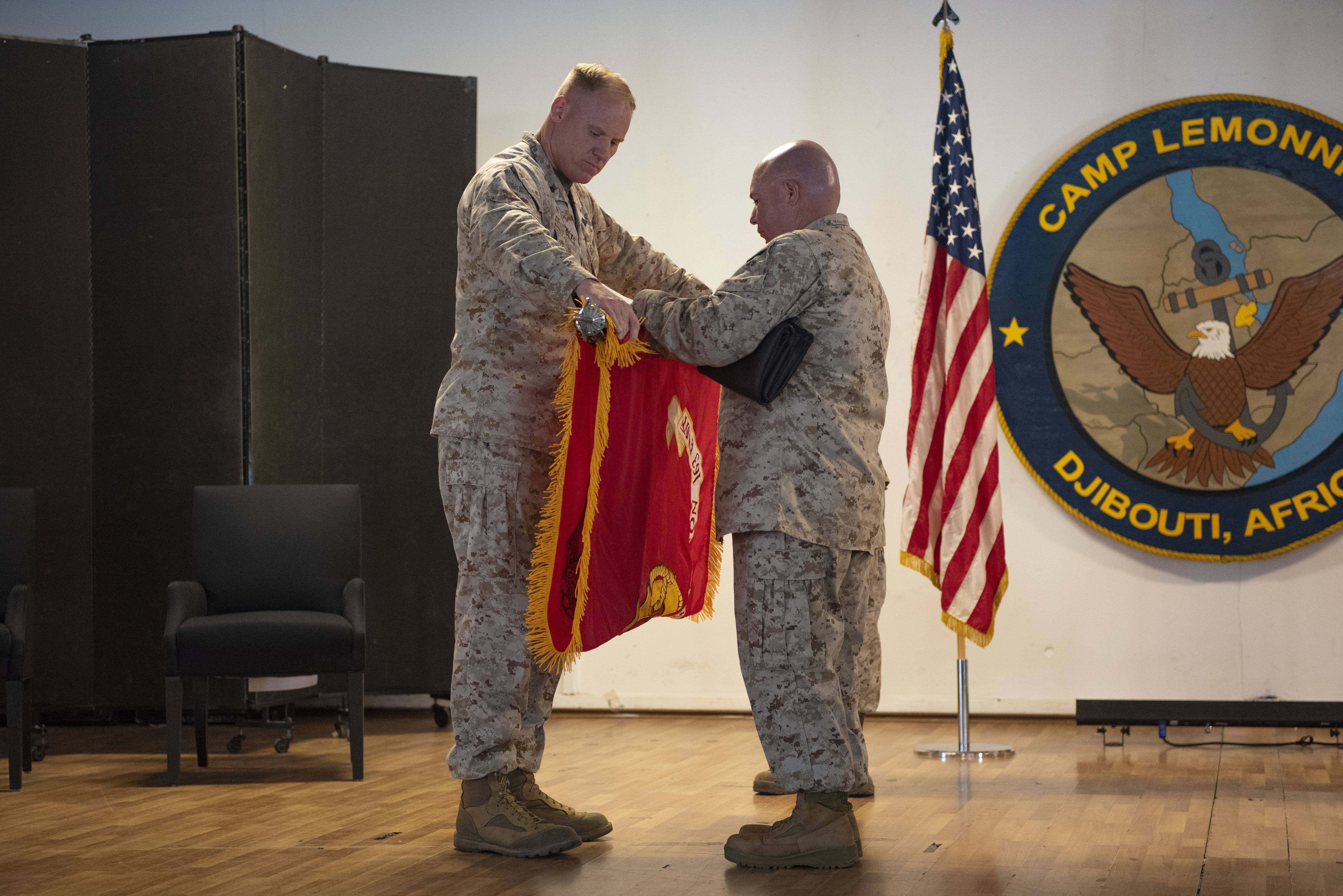 U.S. Army Brig. Gen. Matthew Brown, Combined Joint Task Force - Horn of Africa commanding general, presided over the CJTF- HOA change of responsibility from U.S. Air Force Chief Master Sgt. Ted Braxton, outgoing CJTF- HOA command senior enlisted leader, to U.S. Marine Corps Sgt. Maj. Mike Brown, incoming CJTF-HOA CSEL, at Camp Lemonnier, Djibouti, Aug. 11.