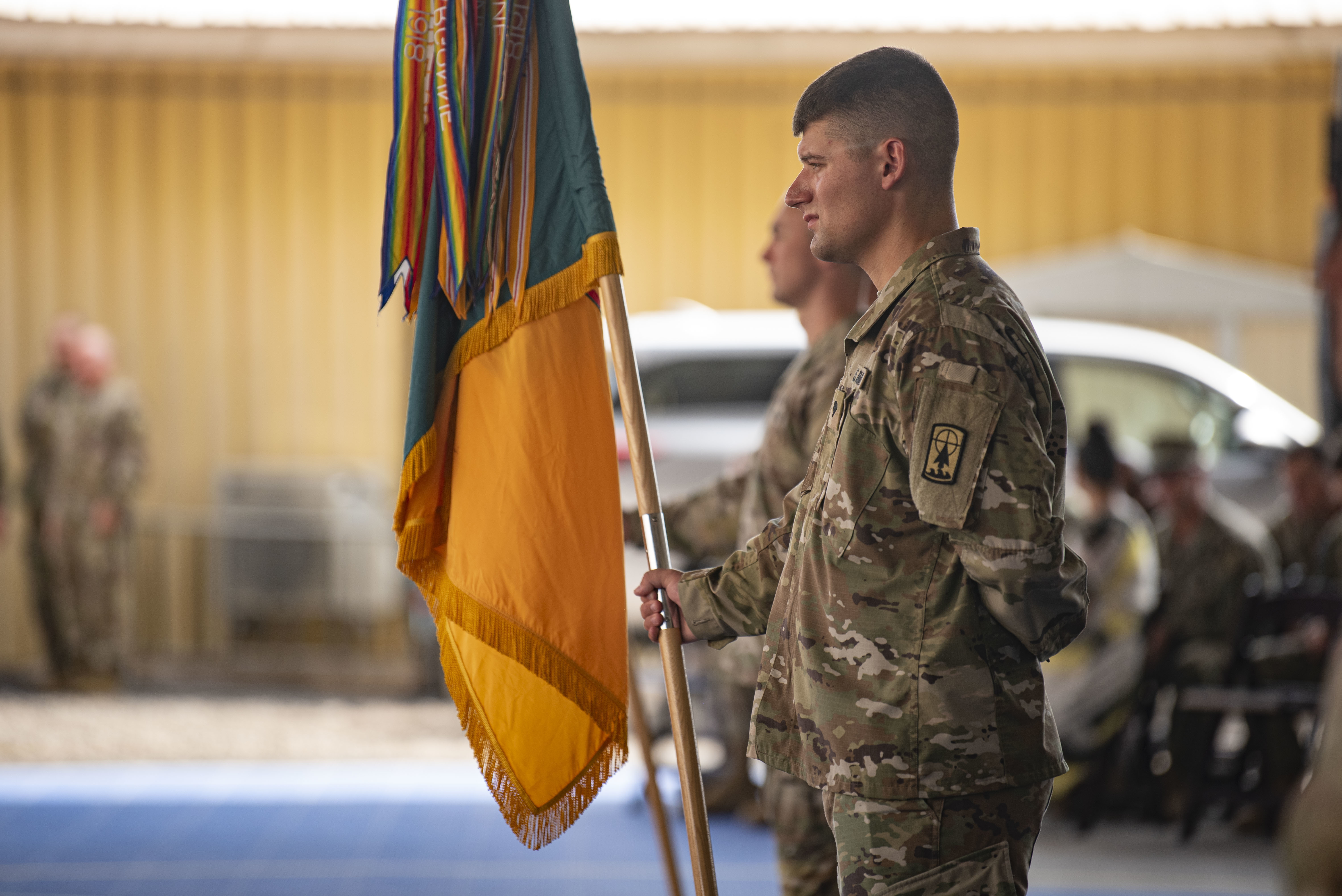 A guidon bearer from the Wisconsin Army National Guard’s 157th Maneuver Enhancement Brigade holds the unit's colors during a Transfer of Responsibility ceremony at Camp Lemonnier, Djibouti, Nov. 5, 2022. During the ceremony, the 157th MEB assumed responsibility for the Combined Joint Task Force - Horn of Africa headquarters staff mission. (Department of Defense photo by U.S. Air Force Staff Sgt. Thomas Johns)