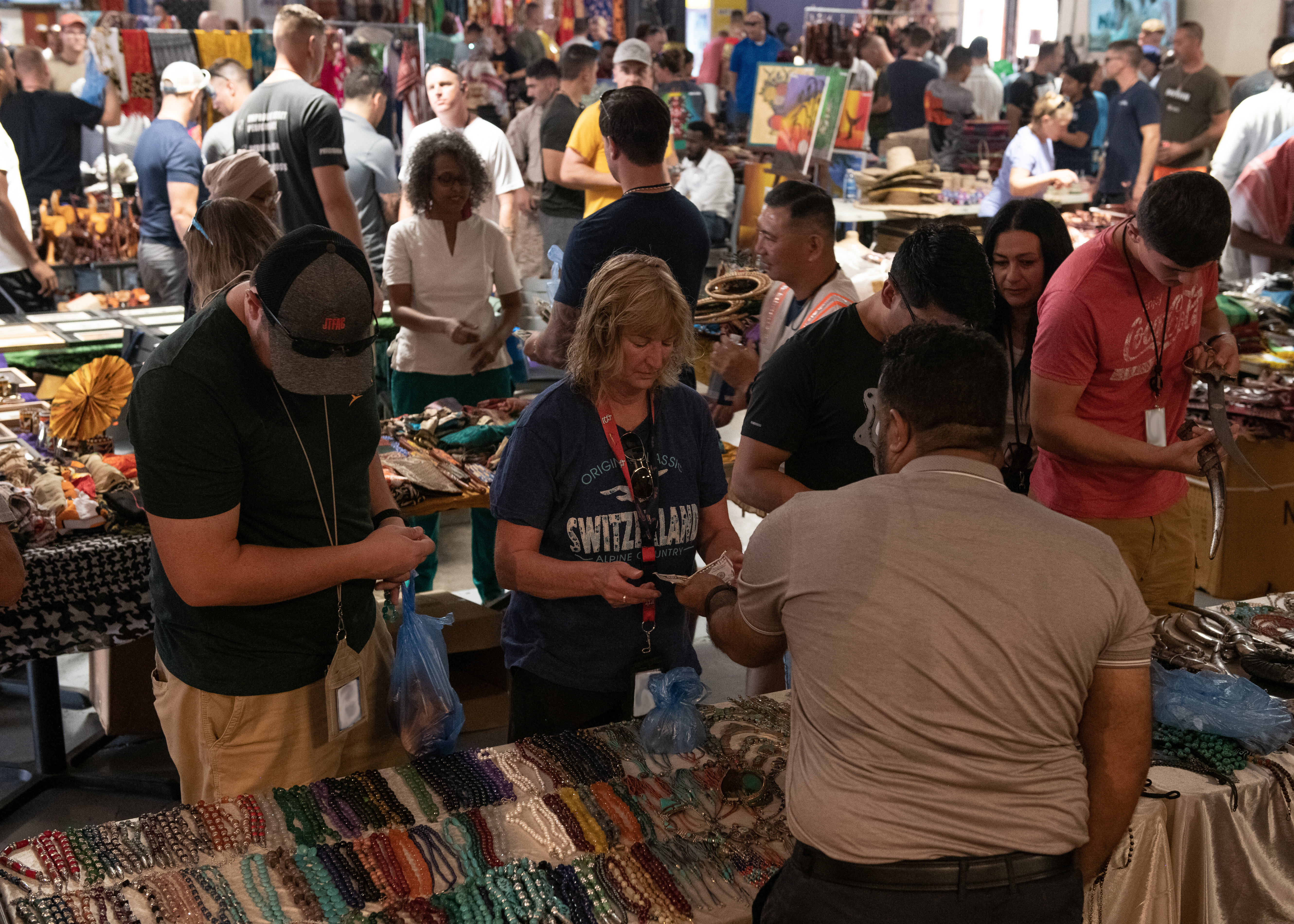 Base personnel and U.S. service members attend the semiannual Djiboutian crafts bazaar with an assortment of handmade items and clothing from Djiboutian vendors at Camp Lemonnier, Djibouti, Nov.19, 2022. The bazaar supports the local economy and provides attendees the opportunity to purchase gifts for themselves, their friends or family members. (Department of Defense photo by U.S. Army Spc. Emily Held)