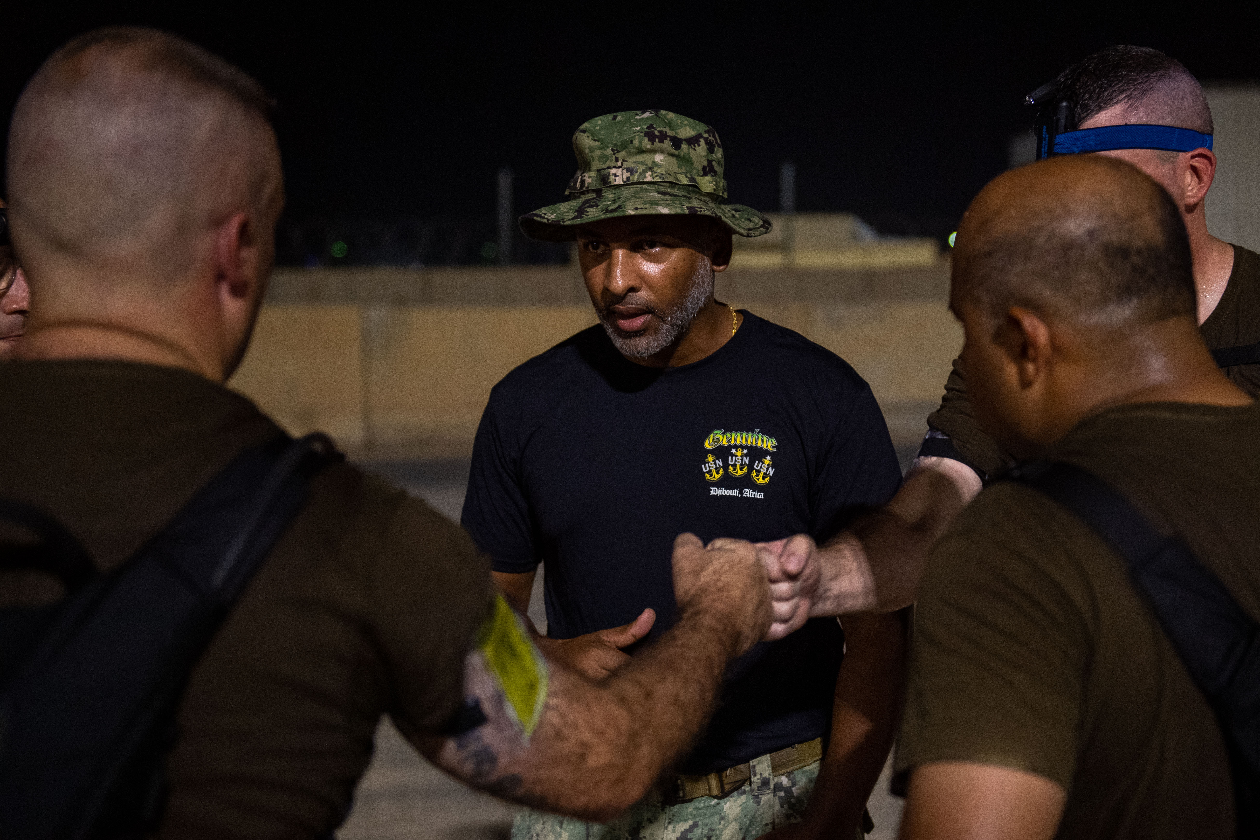 Senior Chief Samson Desta speaks to CPO Initiation course selectees after physical training at Camp Lemonnier, Djibouti, Sept. 28, 2023. The six week course consisted of education, team building exercises, and various other forms of training to ensure they are ready for the responsibility of the U.S. Navy rank of Chief Petty Officer and was open to all military branches. (Department of Defense photo by U.S. Air Force Staff Sgt. Douglas Lorance)