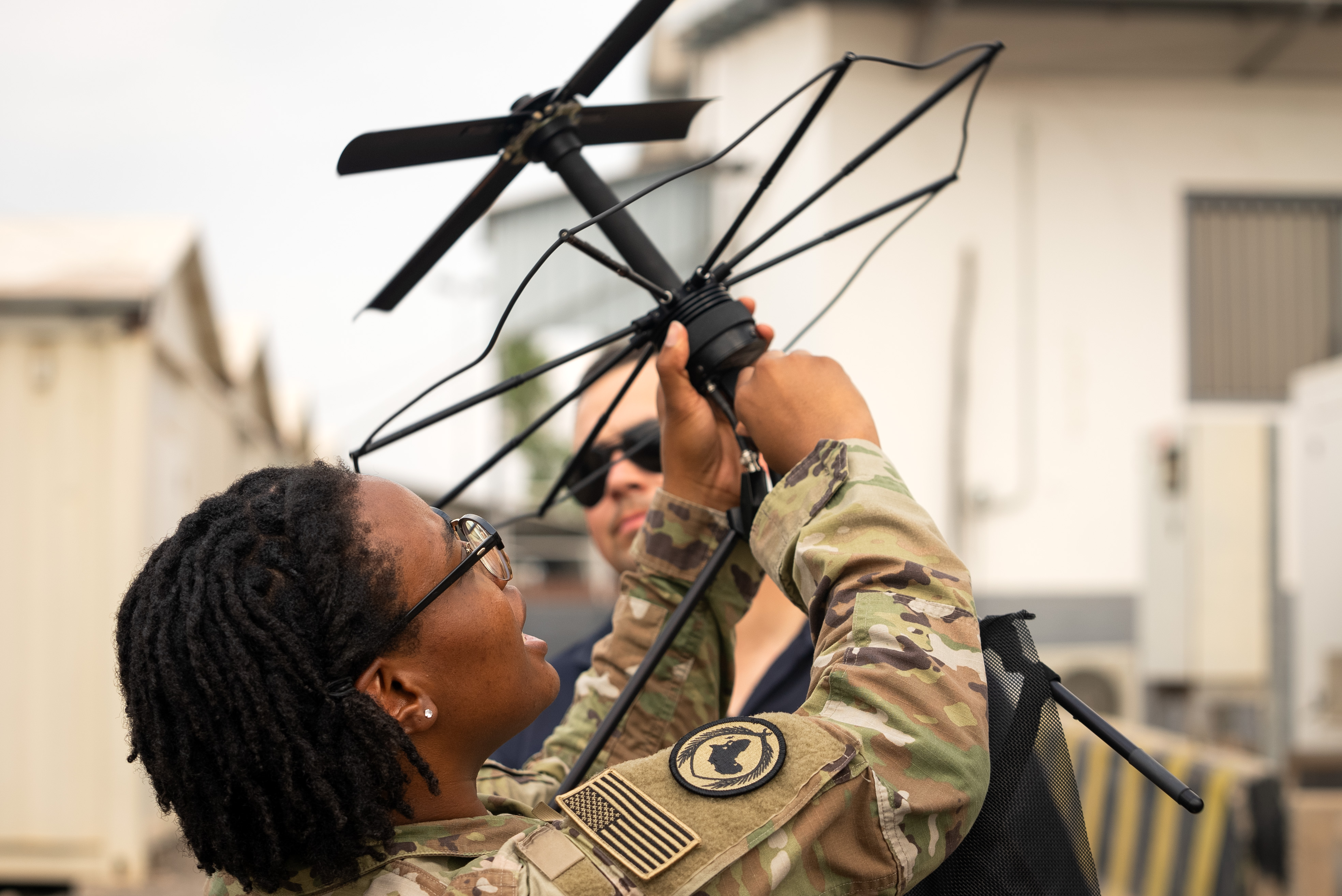 U.S. Army Spc. Phantajia Smith, Combined Joint Task Force-Horn of Africa radio maintenance specialist, configures a radio antenna during a communications exercise at Camp Lemonnier, Djibouti, Sept. 27, 2023. Communications specialists are functional experts in the realms of fixing and providing the technology for anyone leaving the confines of Camp Lemonnier. (Department of Defense photo by U.S. Air Force Staff Sgt. Dylan Gentile)
