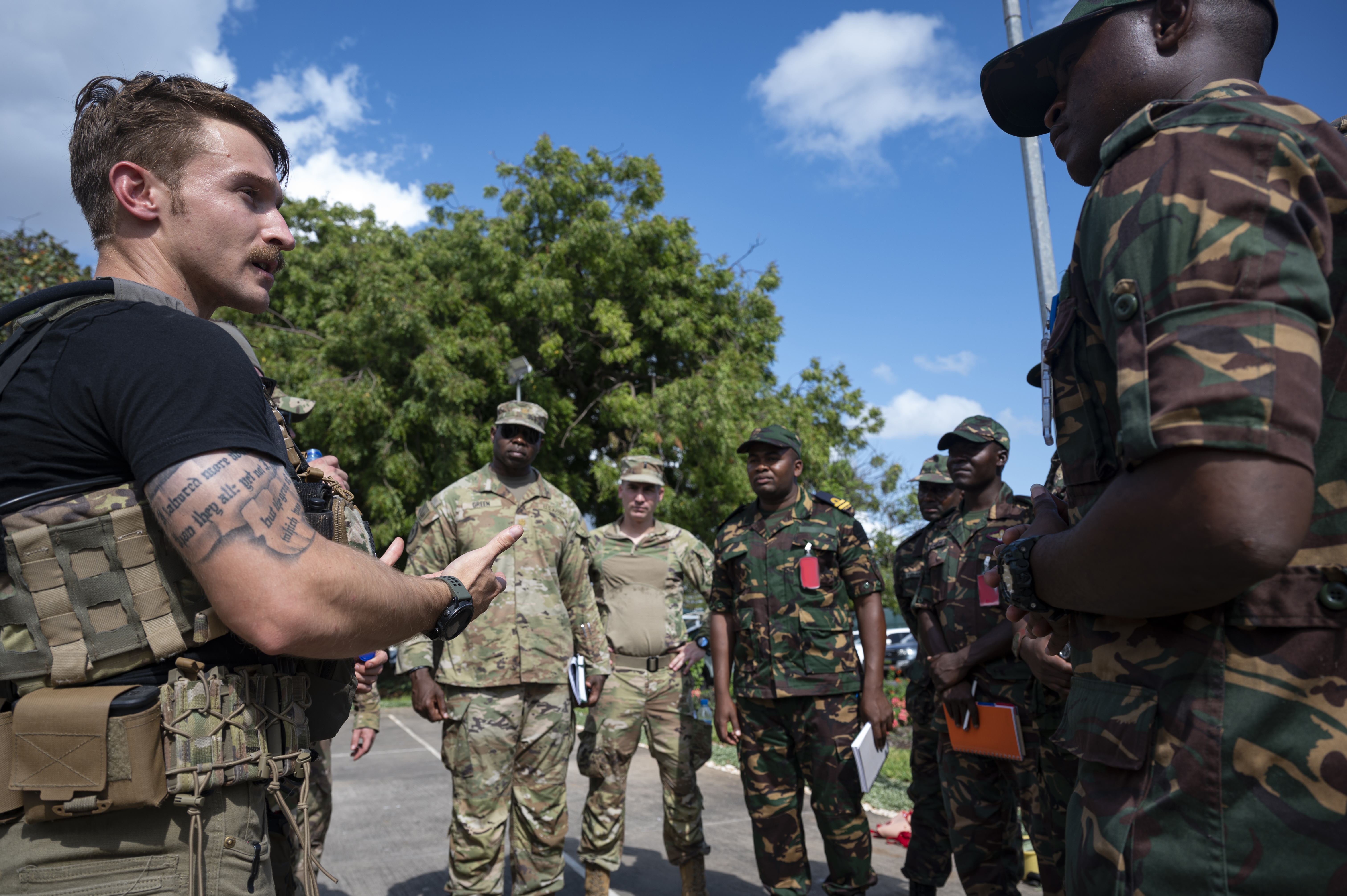 A member of the East Africa Response Force (EARF), assigned to Combined Joint Task Force Ð Horn of Africa (CJTF-HOA), engages in a knowledge exchange with members of the Tanzanian PeopleÕs Defense Force at the U.S. Embassy in Tanzania during an Emergency Deployment Readiness Exercise Oct. 11, 2023, at Dar es Salaam, Tanzania. The EARF is a U.S. Army National Guard infantry company tasked with providing rapid security augmentation, humanitarian aid and disaster response assistance, and military-assisted departure of Department of State personnel at U.S. embassies during crises throughout the African continent. (U.S. Air Force photo by Tech. Sgt. Ridge Shan)