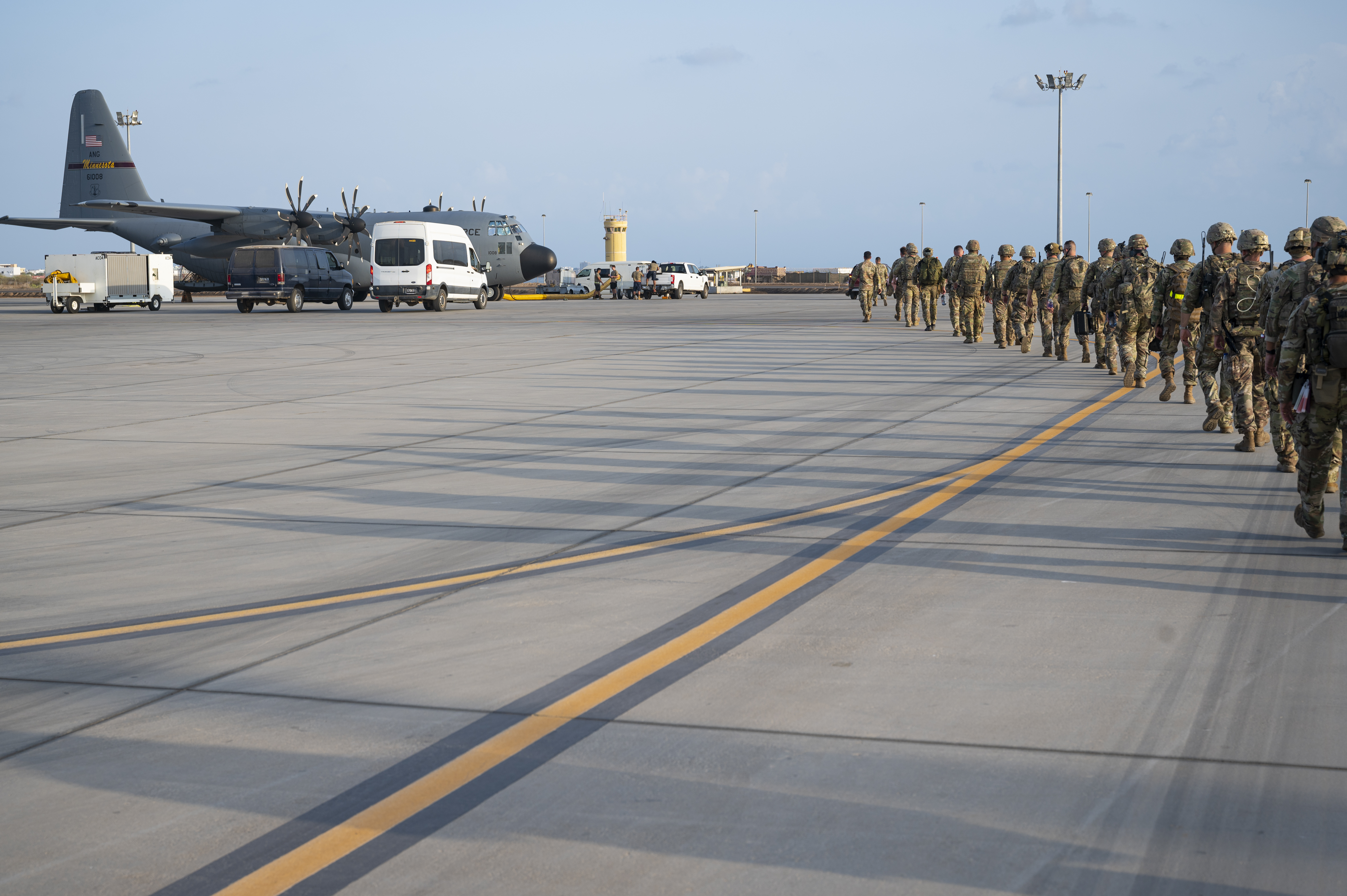 Members of the East Africa Response Force (EARF), assigned to Combined Joint Task Force Ð Horn of Africa (CJTF-HOA), prepare to board a U.S. Air Force C-130 transport aircraft to provide and practice embassy security augmentation during an Emergency Deployment Readiness Exercise at the U.S. Embassy in Tanzania, Oct. 10, 2023, at Camp Lemonnier, Djibouti. The EARF is a U.S. Army National Guard infantry company tasked with providing rapid security augmentation, humanitarian aid and disaster response assistance, and military-assisted departure of Department of State personnel at U.S. embassies during crises throughout the African continent. (U.S. Air Force photo by Tech. Sgt. Ridge Shan)