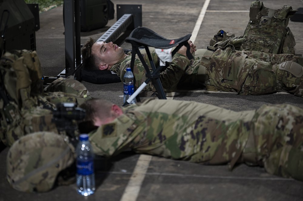 Members of the East Africa Response Force (EARF), assigned to Combined Joint Task Force Ð Horn of Africa (CJTF-HOA), rest before their grounds patrol shift begins at the U.S. Embassy in Tanzania in order to practice embassy security augmentation during an Emergency Deployment Readiness Exercise Oct. 10, 2023, at Dar es Salaam, Tanzania. The EARF is a U.S. Army National Guard infantry company tasked with providing rapid security augmentation, humanitarian aid and disaster response assistance, and military-assisted departure of Department of State personnel at U.S. embassies during crises throughout the African continent. (U.S. Air Force photo by Tech. Sgt. Ridge Shan)