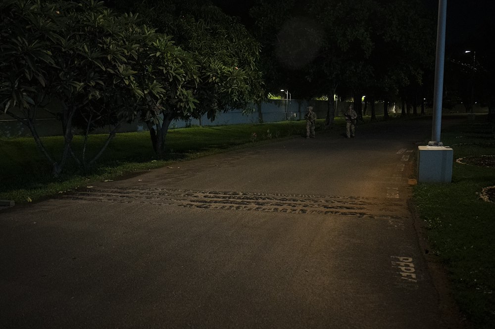 Members of the East Africa Response Force (EARF), assigned to Combined Joint Task Force Ð Horn of Africa (CJTF-HOA), patrol the grounds at the U.S. Embassy in Tanzania in order to practice embassy security augmentation during an Emergency Deployment Readiness Exercise Oct. 10, 2023, at Dar es Salaam, Tanzania. The EARF is a U.S. Army National Guard infantry company tasked with providing rapid security augmentation, humanitarian aid and disaster response assistance, and military-assisted departure of Department of State personnel at U.S. embassies during crises throughout the African continent. (U.S. Air Force photo by Tech. Sgt. Ridge Shan)