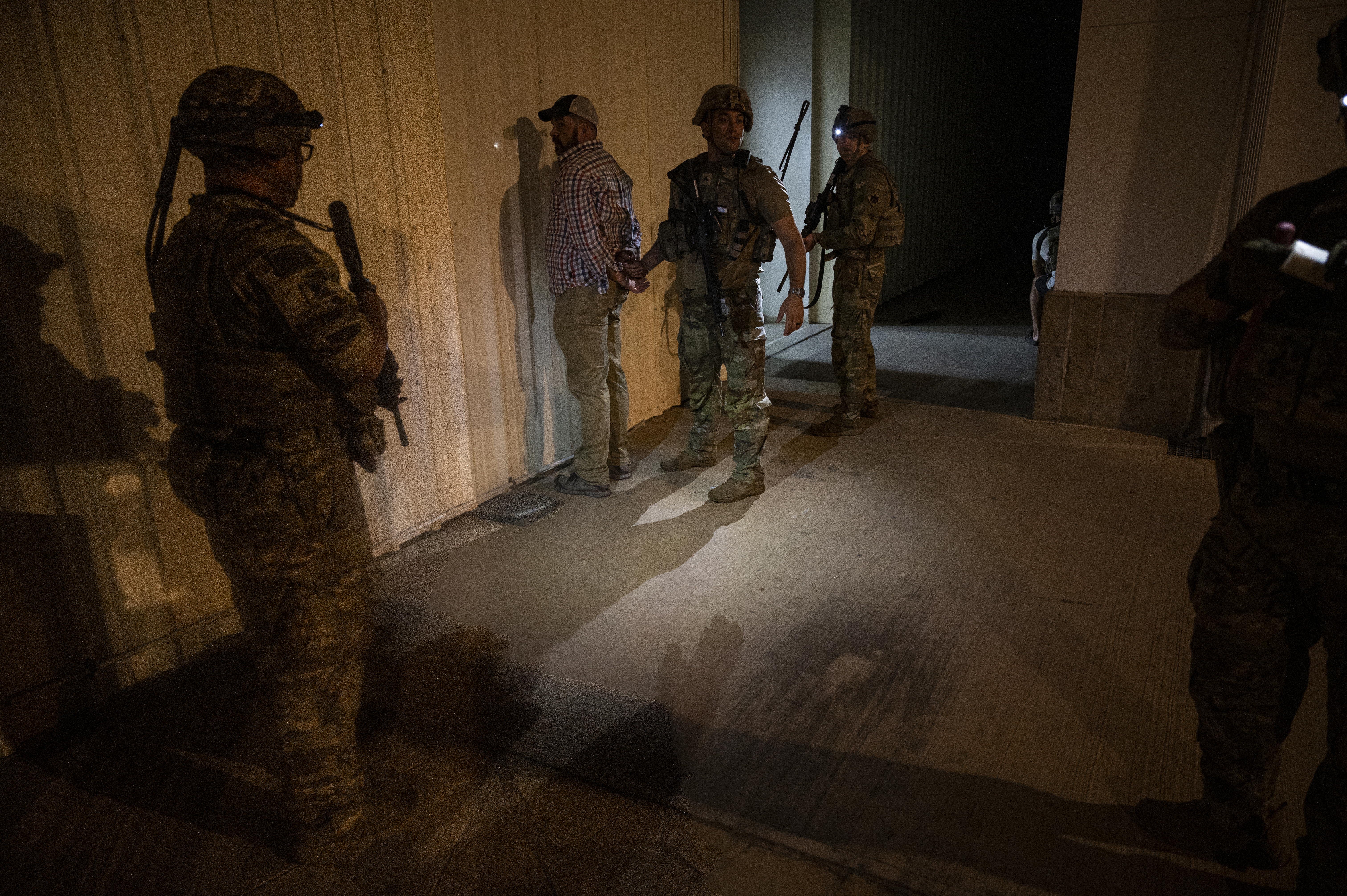 Members of the East Africa Response Force (EARF), assigned to Combined Joint Task Force Ð Horn of Africa (CJTF-HOA), detain an intruder role-player during an intruder response scenario at the U.S. Embassy in Tanzania during an Emergency Deployment Readiness Exercise Oct. 11, 2023, at Dar es Salaam, Tanzania. The EARF is a U.S. Army National Guard infantry company tasked with providing rapid security augmentation, humanitarian aid and disaster response assistance, and military-assisted departure of Department of State personnel at U.S. embassies during crises throughout the African continent. (U.S. Air Force photo by Tech. Sgt. Ridge Shan)