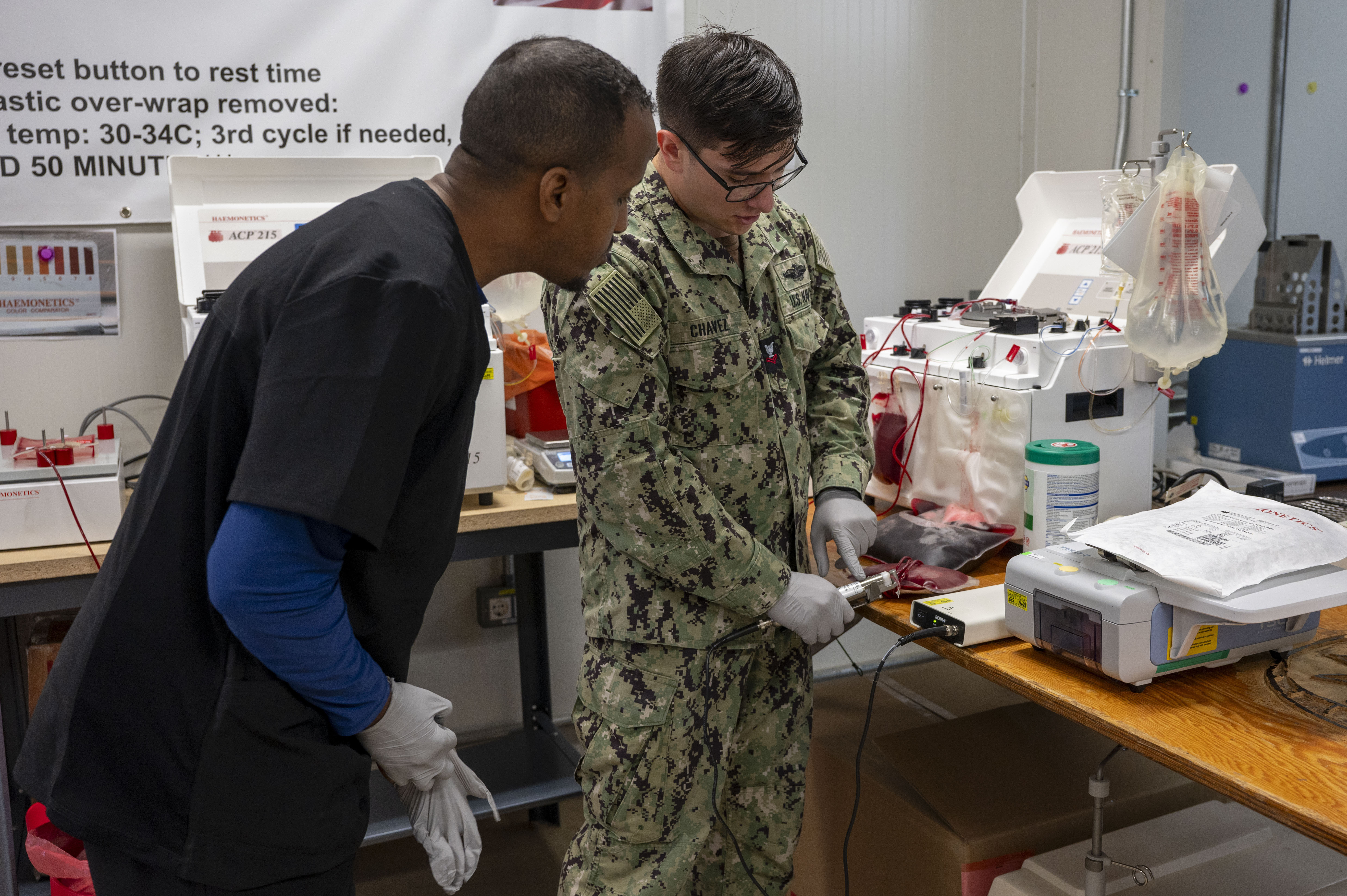 U.S. Navy Hospital Corpsman Second Class Abenicio Chavez, a member of the blood depot section of Sigonella’s Naval Training Readiness Medical Center, visited Djibouti to test the mission readiness of medical personnel stationed in the Horn of Africa on Jan. 11, 2024 at Camp Lemonnier, Djibouti. Chavez conducted a walkthrough on the blood deglycerization process to help service members and U.S. Embassy technicians effectively extract glycerin from frozen blood samples. (U.S. Army National Guard photo by Sgt. Jalen Miller)
