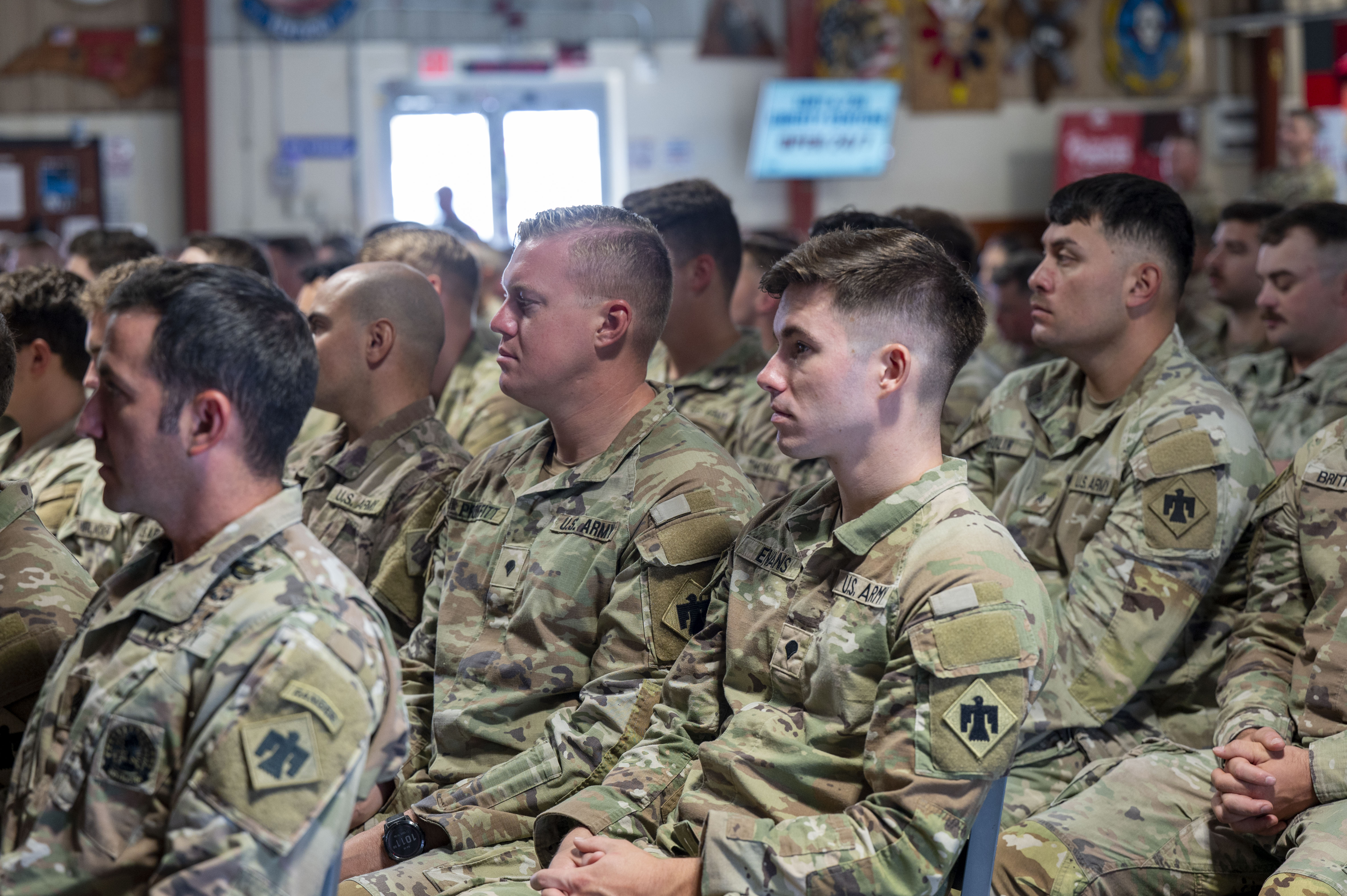 Soldiers from Task Force Tomahawk sit in the crowd during their transfer of authority ceremony at Camp Lemonnier, Djibouti Feb. 10, 2024. This ceremony marks the end of Task Force Tomahawk's tenure in the Combined Joint Task Force - Horn of Africa, the outgoing security forces brigade turned over control to the incoming Task Force Paxton. (U.S. Army National Guard photo by Sgt. Jalen Miller)