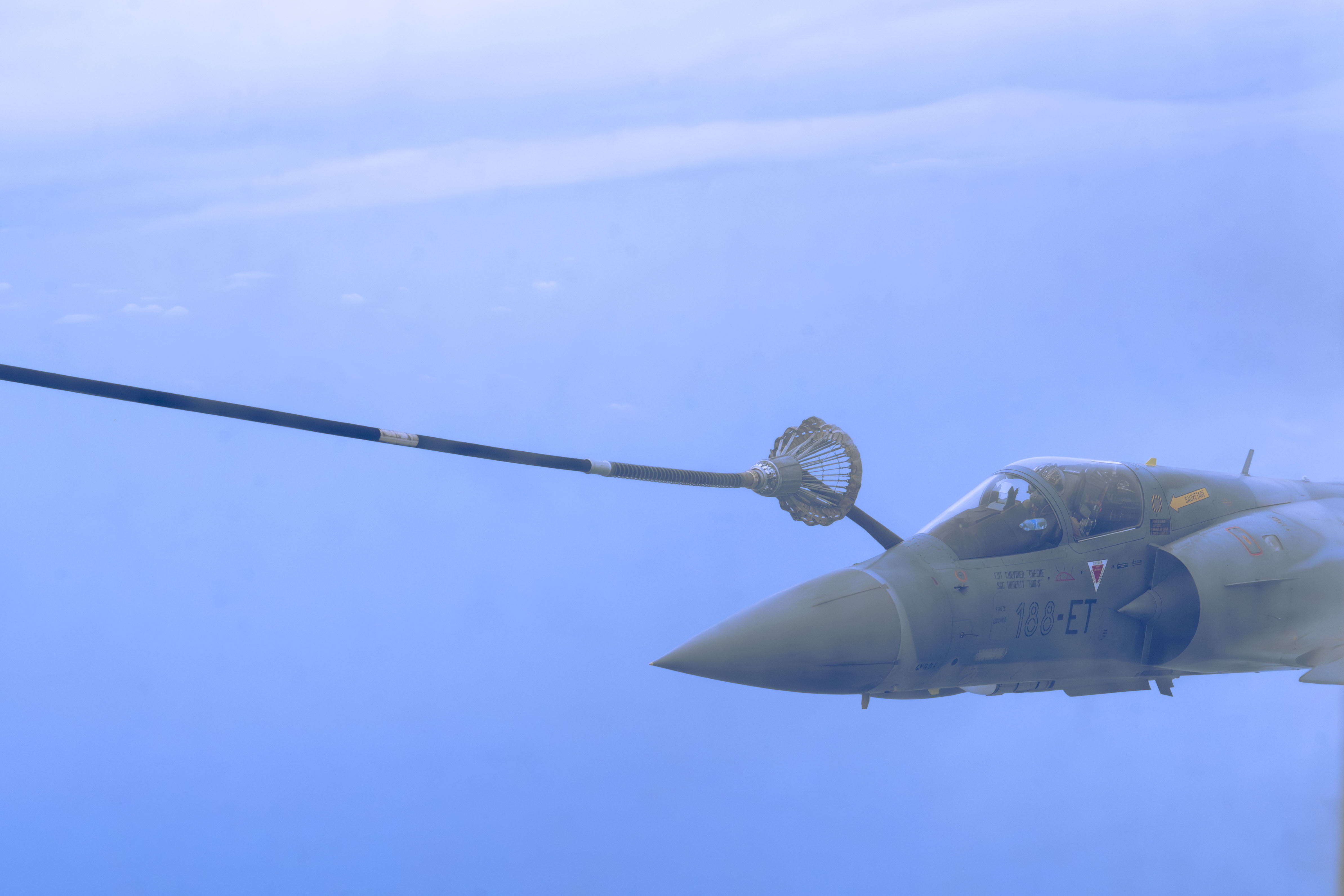 French pilots participate in a refueling mission, Camp Lemonnier Djibouti Mar 25, 2024. Team Bronco is tasked with critical operations, ranging from aerial refueling to tactical support missions. (U.S. Air National Guard Photo by Senior Airman John Macera)