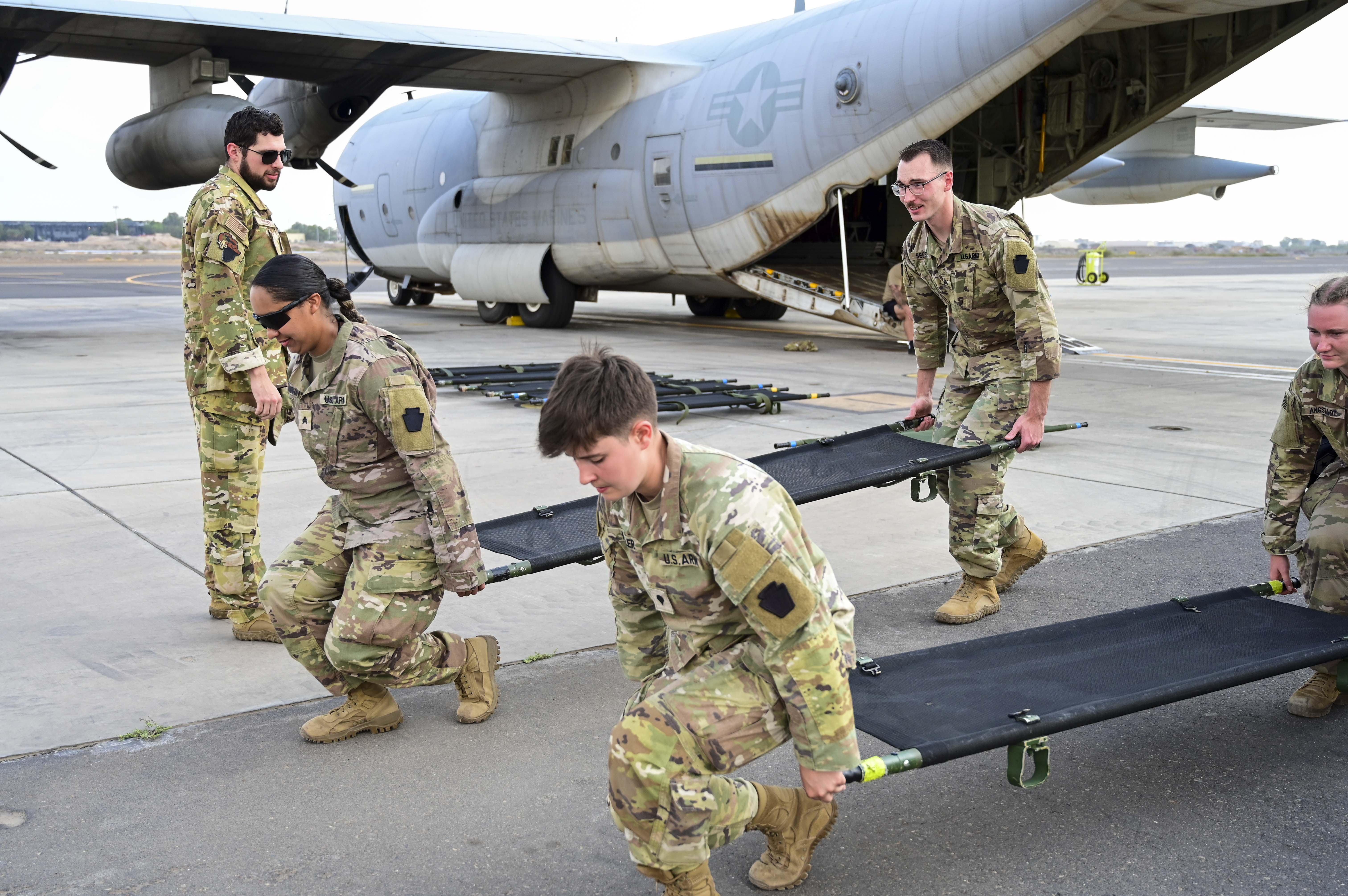 U.S. Army Sgt. Tiffany Cunningham (left), Spc. Isabel Hiller (right) and Staff Sgt. Cody Seese (back), combat medics with Task Force Paxton, 56th Stryker Brigade Combat Team, Pennsylvania National Guard conduct joint medical evacuation cold-load training aboard a KC-130J aircraft at Camp Lemonnier, Djibouti, March 5, 2024. The purpose of the training is to ensure interoperability with key U.S. military assets to expedite patient transfers to and from an aircraft in the event life saving measures and medical evacuation are requested. (U.S. Army National Guard photo by Cpt. Amanda Mayer)