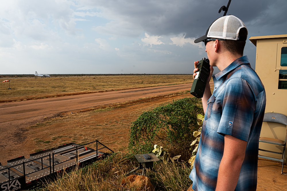 U.S. Army Spc. Gabriel Rudicel, an air traffic control operator with the 3-58th Airfield Operations Battalion, talks on the radio as he watches an aircraft arrive at Baledogle Military Airfield, April 11, 2024. The 3-58th AOB provides air traffic control and airfield management support for outstations within the Combined Joint Task Force - Horn of Africa area of responsibility. (U.S. Air National Guard photo by Senior Airman Kevin Nious)