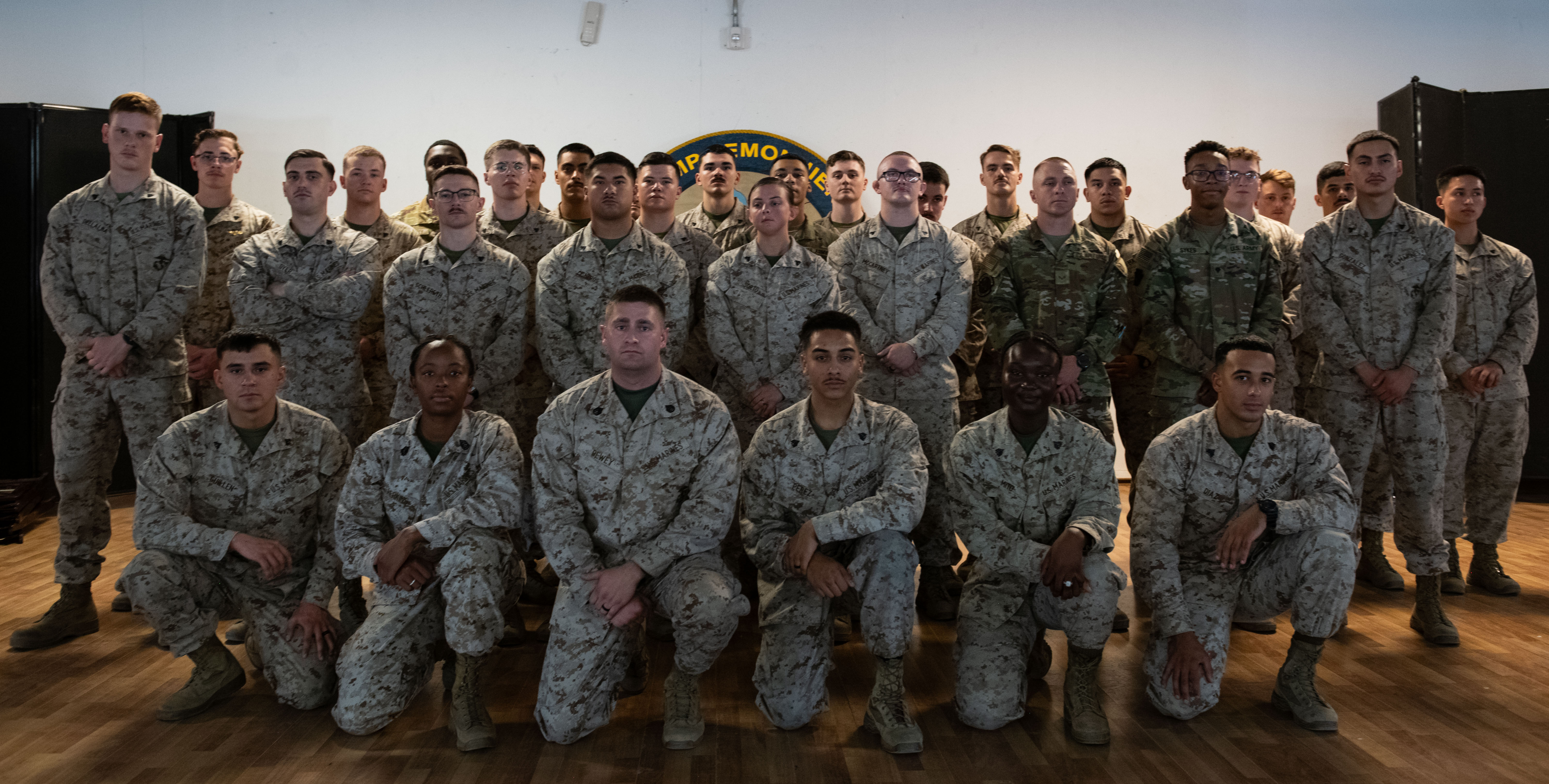 U.S. service members pose for a photo during a graduation ceremony for the Marine Corporals Course at Camp Lemonnier, Djibouti, on July 19, 2024. The course teaches leadership skills and prepares students to assume greater responsibilities as noncommissioned officers. (U.S. Air National Guard photo by Tech. Sgt. Kathleen LaCorte)