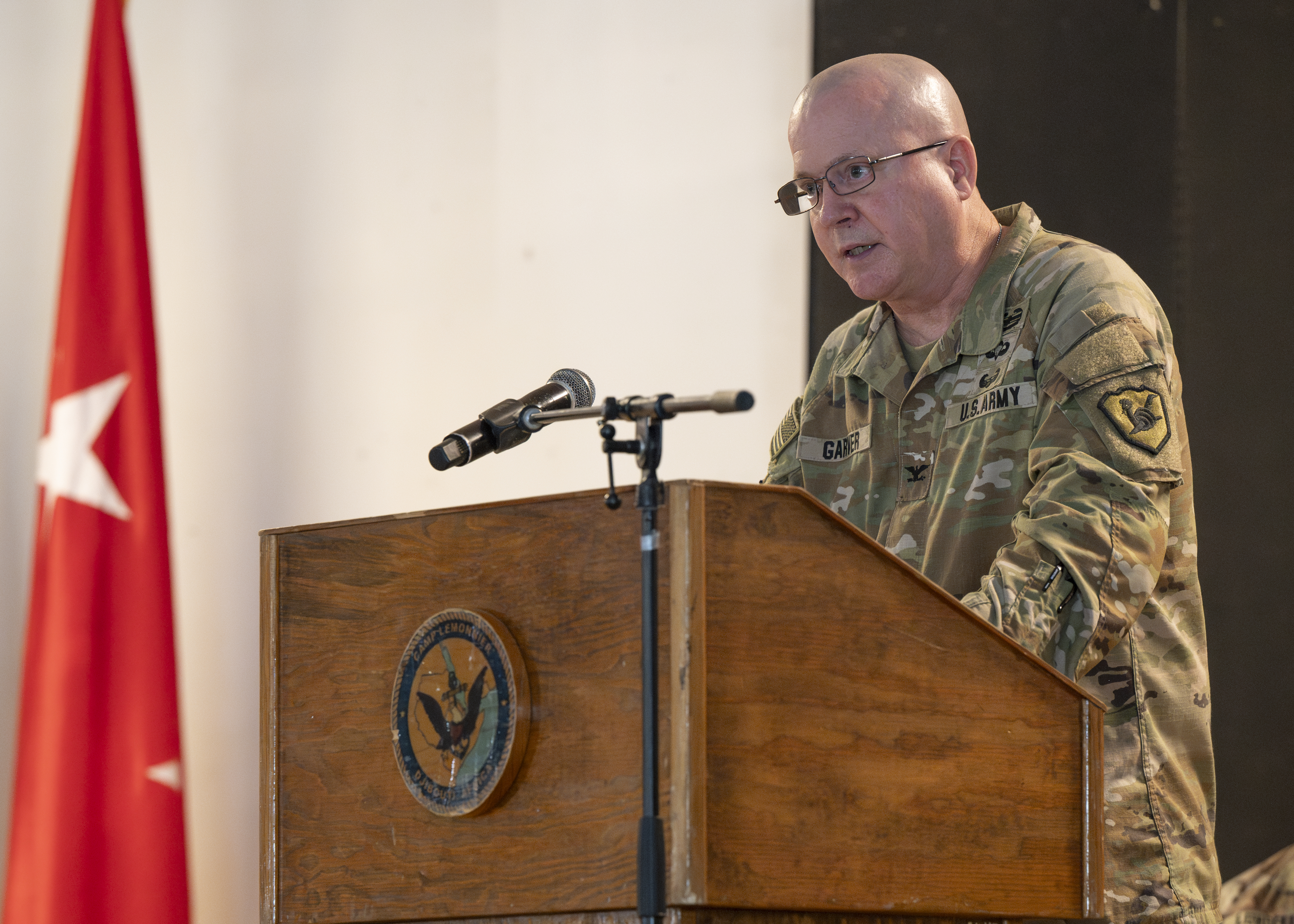 Col. Pete Garver, commander of the Arizona National Guard 158th Maneuver Enhancement Brigade (MEB), gives words of encouragement to his soldiers as they assume command of the Combined Joint Task Force - Horn of Africa during a transfer of authority ceremony at Camp Lemonnier on Dec. 13, 2024. The 158th MEB hails from Phoenix, Az and will serve as the tenant MEB of the Combined Joint Task Force - Horn of Africa for the next 9 months. (U.S. Air National Guard Photo by Tech. Sgt. George Keck)