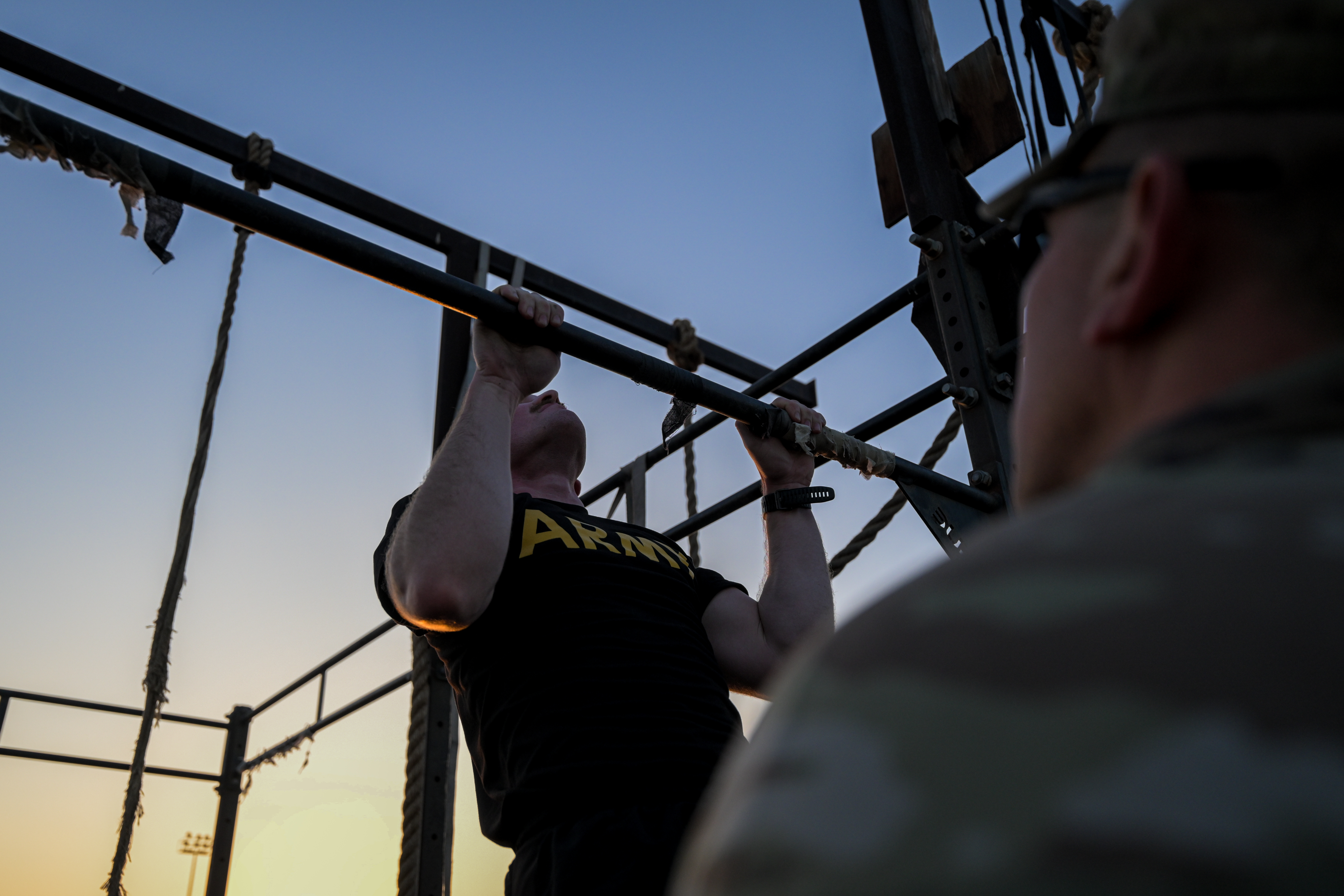 A U.S. Army Soldier assigned to Task Force Associator performs pull ups during the French Desert Commando Course tryouts at Camp Lemonnier, Djibouti, Jan. 22, 2025. For years, the French forces in Djibouti have invited U.S. service members from Combined Joint Task Force - Horn of Africa to participate in the competition that occurs later this year. (U.S. Air Force photo by Airman 1st Class Synsere Howard)