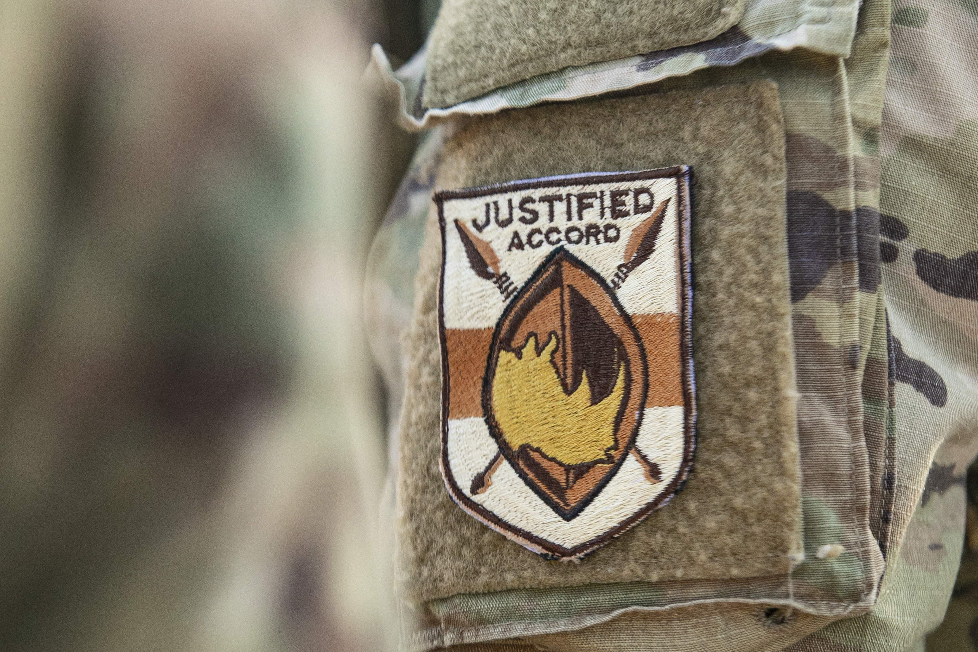 A U.S. Army soldier dons the official exercise patch on day two of exercise Justified Accord 2025 (JA25) at the Msata Military Training Base in Msata, Tanzania, Feb. 12, 2025. JA25 is the premier U.S. Africa Command (USAFRICOM) exercise in East Africa, designed to enhance multinational combat readiness, strengthen crisis response capabilities and empower allies and partners in the region. Led by U.S. Army Southern European Task Force, Africa (SETAF-AF) and hosted in Kenya, Djibouti and Tanzania, JA25 integrates high-intensity training scenarios that sharpen warfighting skills, increase operational reach and enhance the ability to execute complex joint and multinational operations. The exercise runs from Feb. 10–21, 2025. (U.S. Army photo by Sgt. Michael Knight)