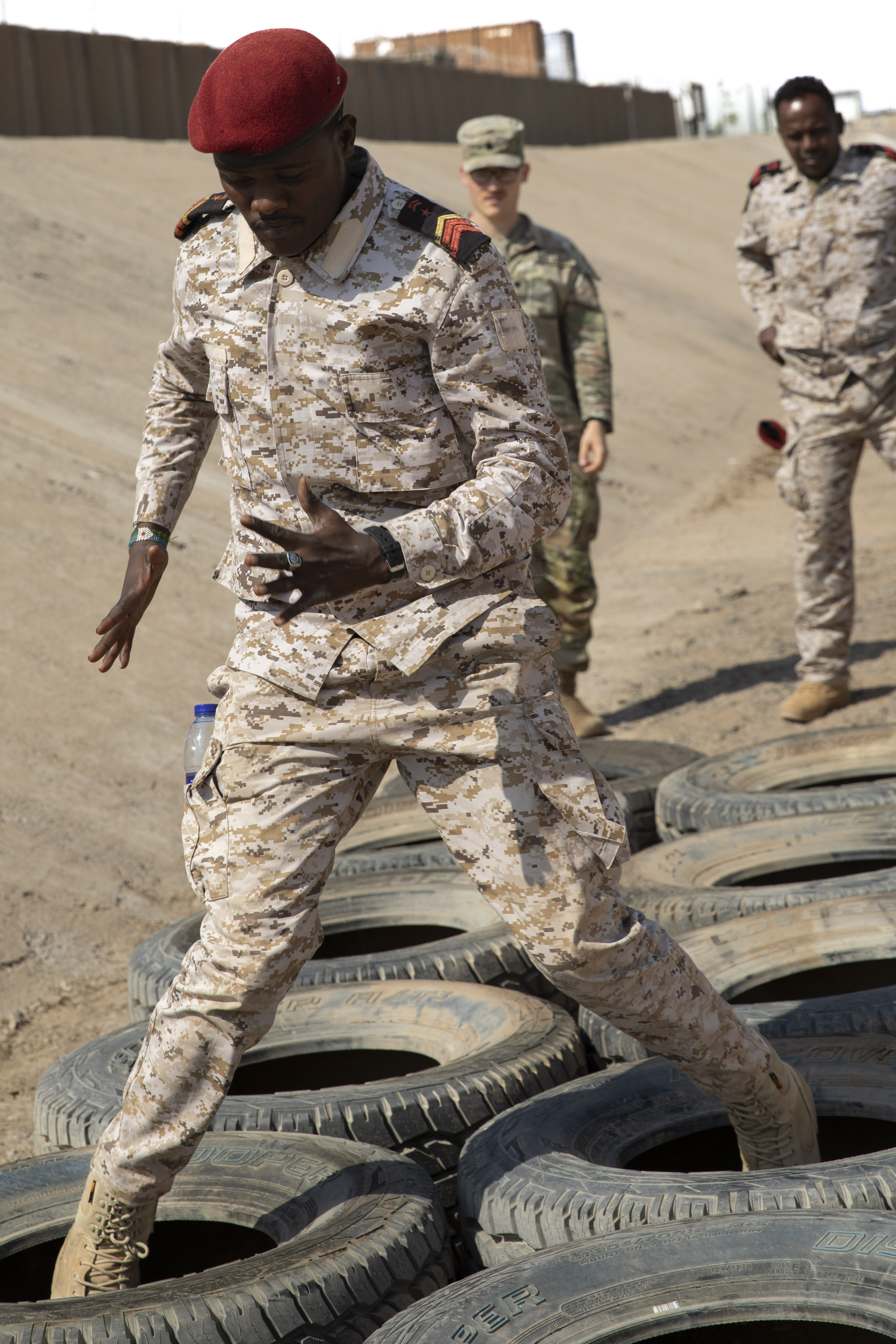 A Djibouti Armed Forces member participates in the tire obstacle course during the Warrior Day competition at Camp Lemonnier, Djibouti, Feb 4, 2025. The obstacle course contained five different sections including high knees, crouch run, hip-high barriers, group wall climb and high crawl. (U.S. Army photo by Spc. Micheala Maldonado)