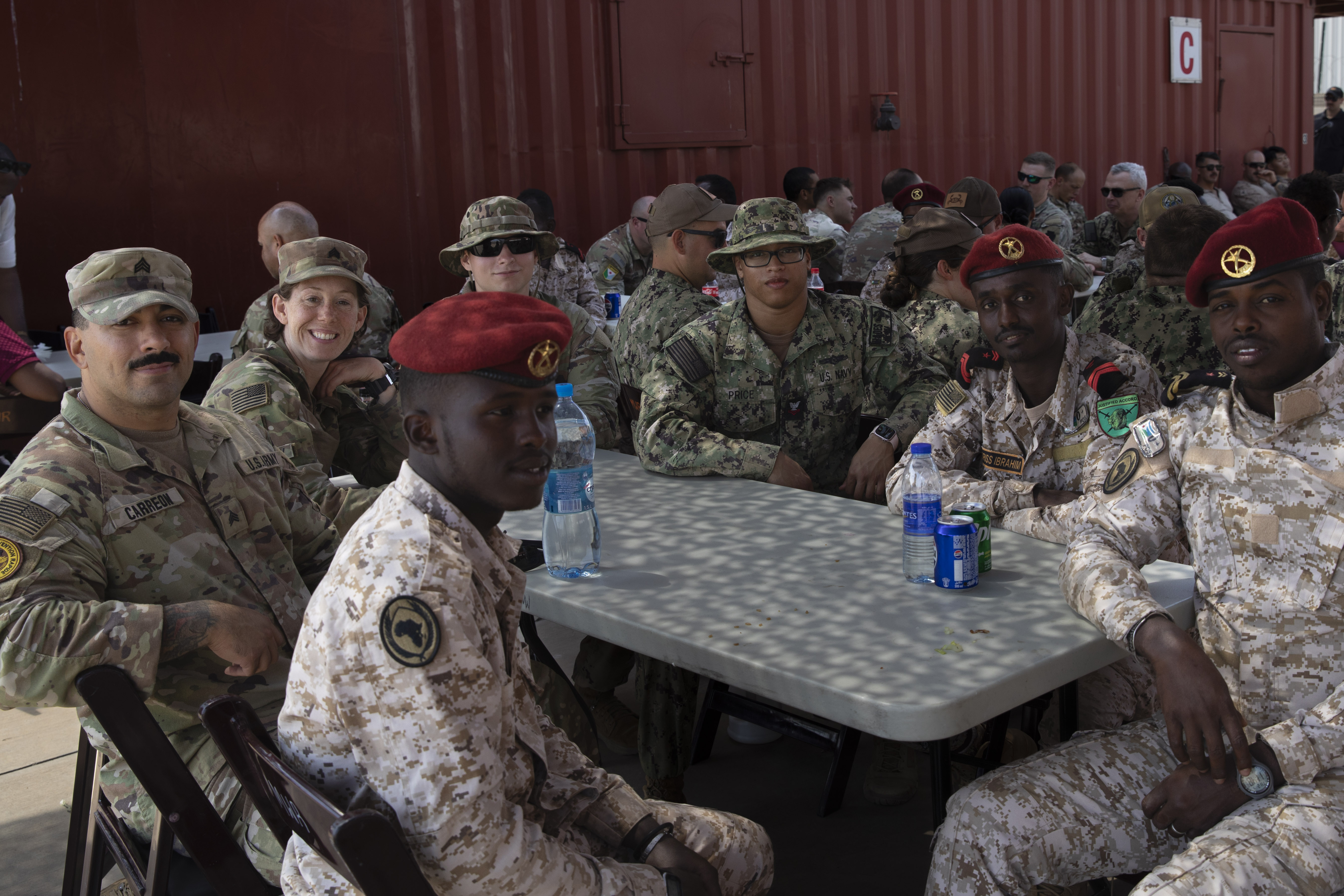 Members from Camp Lemonnier Djibouti - Horn of Africa partner with personnel from the Djibouti Armed Forces as they work together during the Warrior Day competition at Camp Lemonnier, Djibouti, Feb 4, 2025. Before the competition the team enjoyed lunch together embracing comradery and partnership. (U.S. Army photo by Spc. Micheala Maldonado)