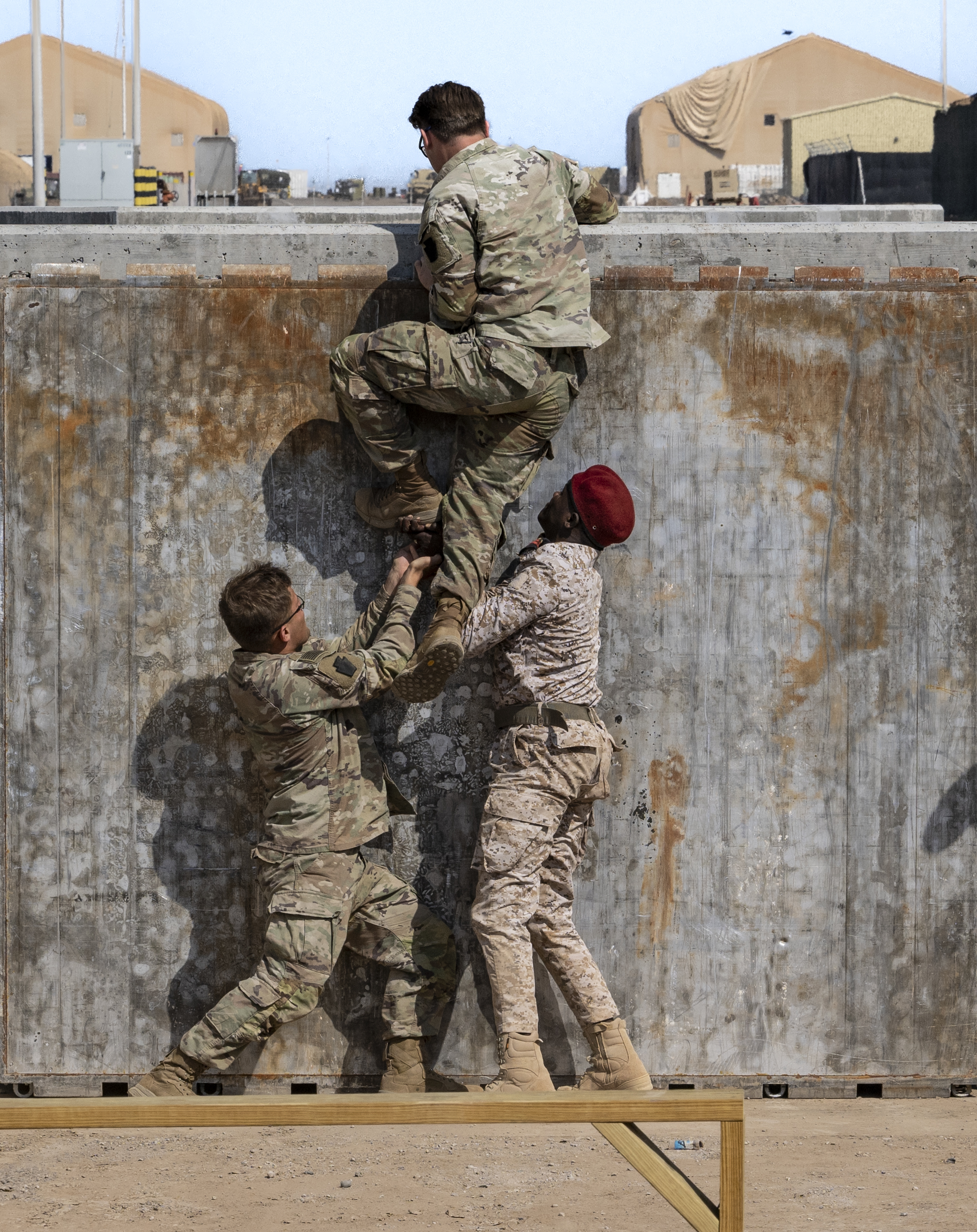 U.S. Army soldiers and Djiboutian Forces Armée Djiboutienne (FAD) service members, assigned to Team Two, perform a wall climb during Warrior Day at Camp Lemonnier, Djibouti, Feb. 4, 2025. Joint events and competitions like Warrior Day reinforce the teamwork and trust essential for mission success with the U.S. and Djiboutian FAD partners. (U.S. Air Force photo by Airman 1st Class Joseph Bartoszek)