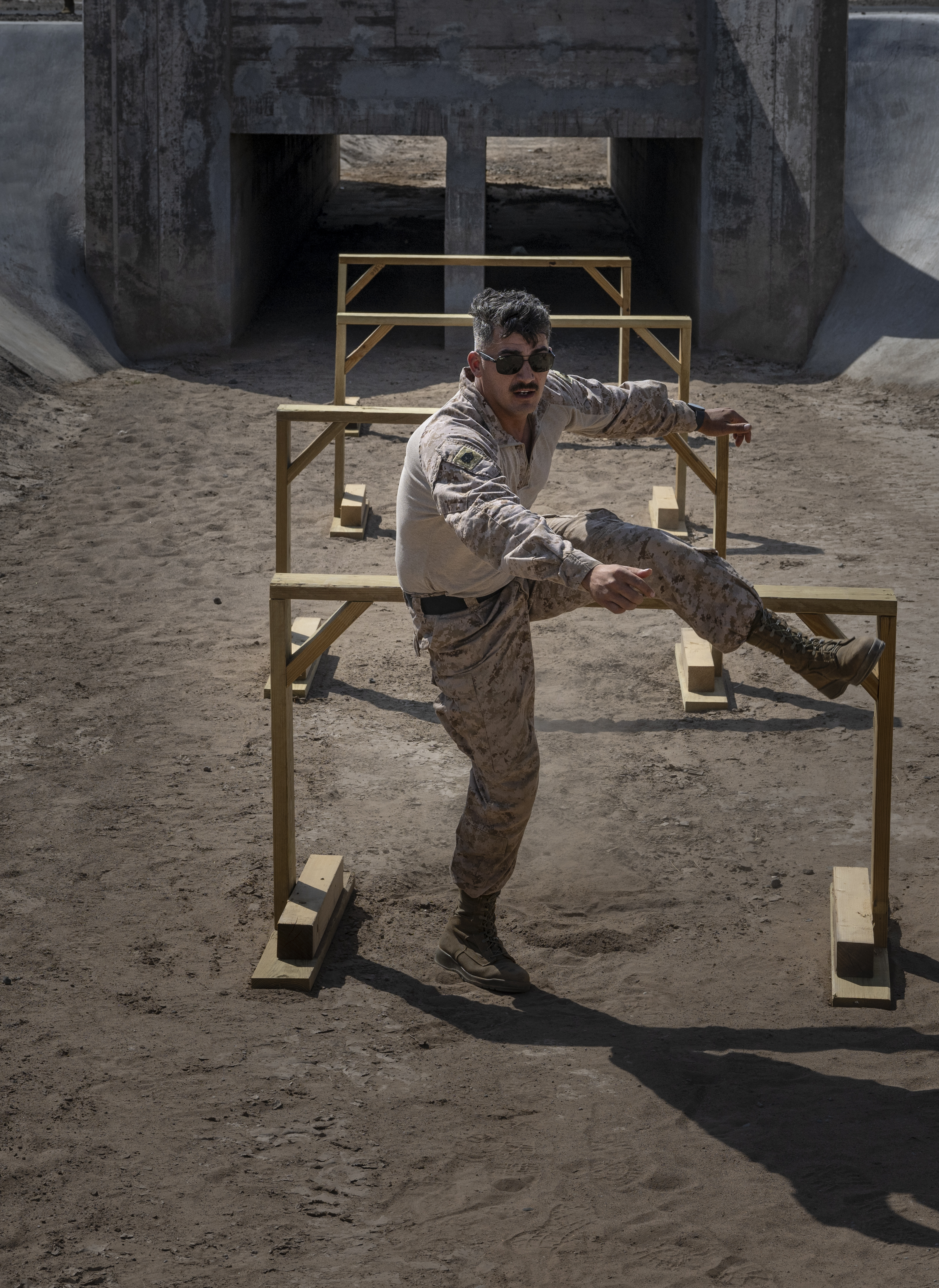 A U.S. Marine, assigned to Team One, hurdles through an obstacle course during Warrior Day at Camp Lemonnier, Djibouti, Feb. 4, 2025. The shared challenges during Warrior Day brought U.S. and Forces Armée Djiboutienne (FAD) service members together, enhancing cooperation and mission success. (U.S. Air Force photo by Airman 1st Class Joseph Bartoszek)