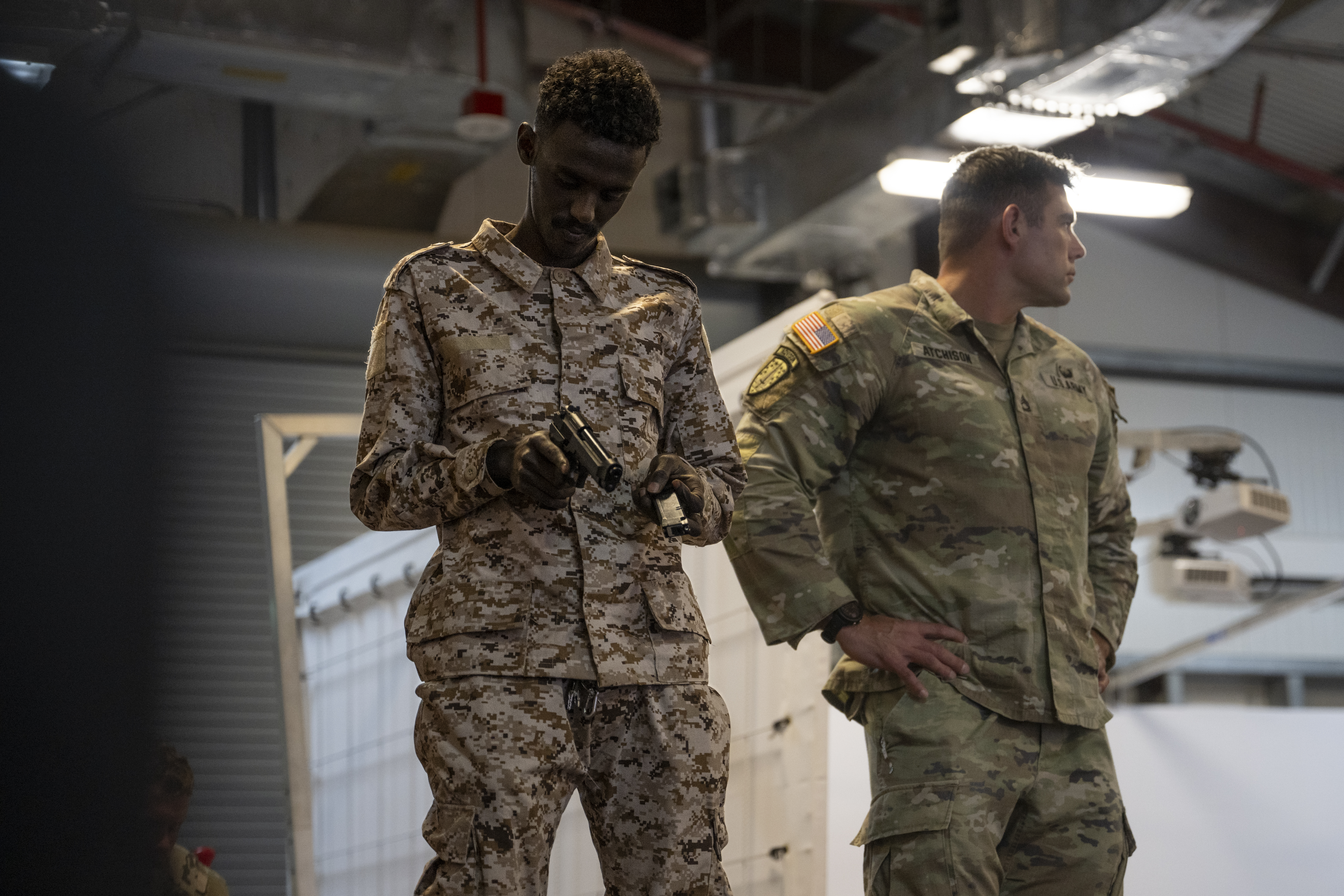 Djiboutian Forces Armée Djiboutienne (FAD) and U.S. Armed Forces service members, assigned to Team One, prepare for the gunfighter virtual shooting range during Warrior Day at Camp Lemonnier, Djibouti, Feb. 4, 2025. Warrior Day fostered teamwork, trust and interoperability, reinforcing the partnership between U.S. and Djiboutian forces. (U.S. Air Force photo by Airman 1st Class Joseph Bartoszek)