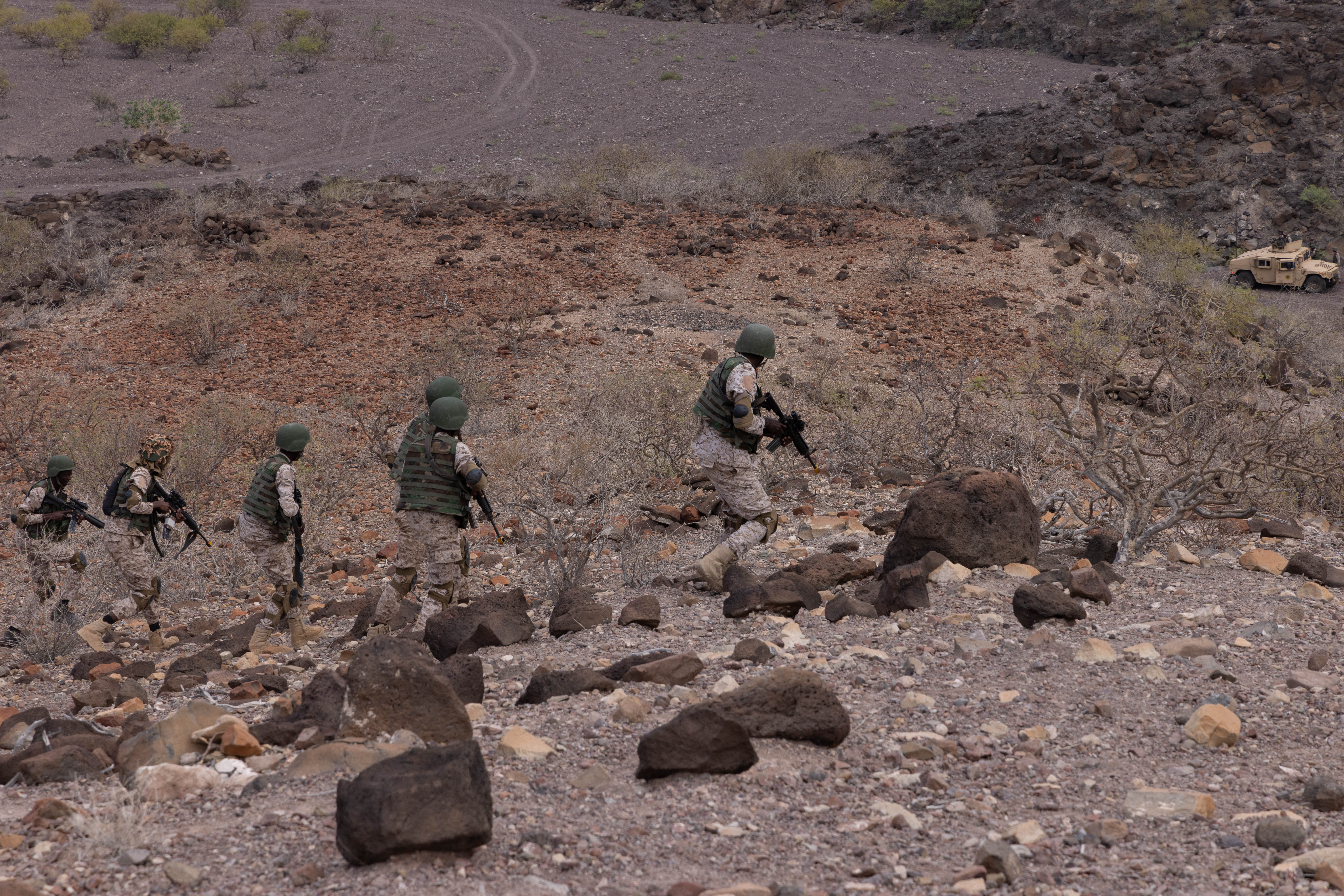 Djiboutian Battalion Intervention Rapide soldiers reestablish firing positions during exercise Justified Accord 2025 at Arta Range Complex, Djibouti, Feb. 11, 2025. JA25 is the premier U.S. Africa Command (USAFRICOM) exercise in East Africa, designed to enhance multinational combat readiness, strengthen crisis response capabilities and empower allies and partners in the region. Led by U.S. Army Southern European Task Force, Africa (SETAF-AF) and hosted in Kenya, Djibouti and Tanzania, JA25 integrates high-intensity training scenarios that sharpen warfighting skills, increase operational reach and enhance the ability to execute complex joint and multinational operations. The exercise runs from Feb. 10–21, 2025. (U.S. Army photo by Cpl. Joey Ke)