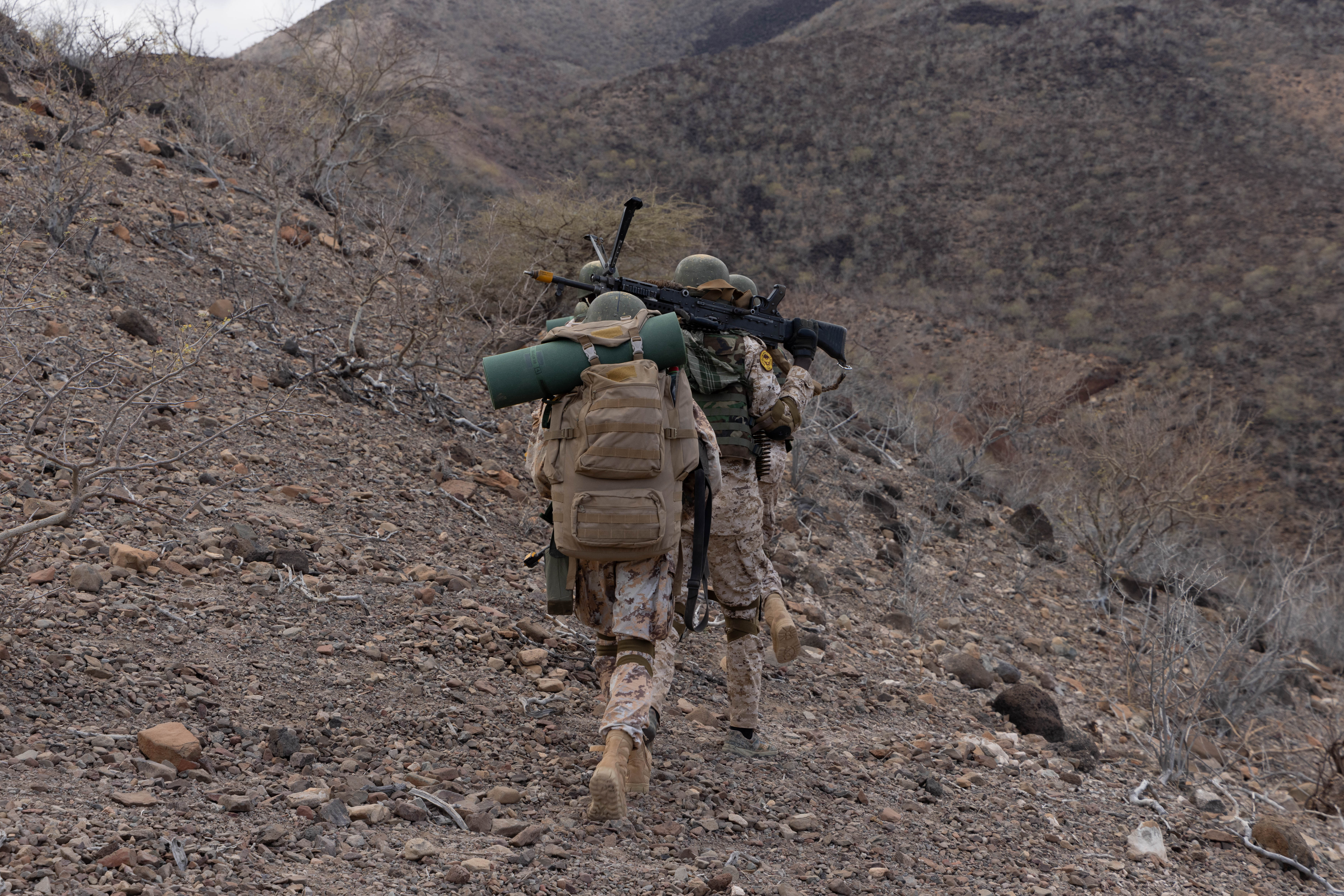 Djiboutian Battalion Intervention Rapide soldiers ruck to firing positions during exercise Justified Accord 2025 at Arta Range Complex, Djibouti, Feb. 11, 2025. JA25 is the premier U.S. Africa Command (USAFRICOM) exercise in East Africa, designed to enhance multinational combat readiness, strengthen crisis response capabilities and empower allies and partners in the region. Led by U.S. Army Southern European Task Force, Africa (SETAF-AF) and hosted in Kenya, Djibouti and Tanzania, JA25 integrates high-intensity training scenarios that sharpen warfighting skills, increase operational reach and enhance the ability to execute complex joint and multinational operations. The exercise runs from Feb. 10–21, 2025. (U.S. Army photo by Cpl. Joey Ke)