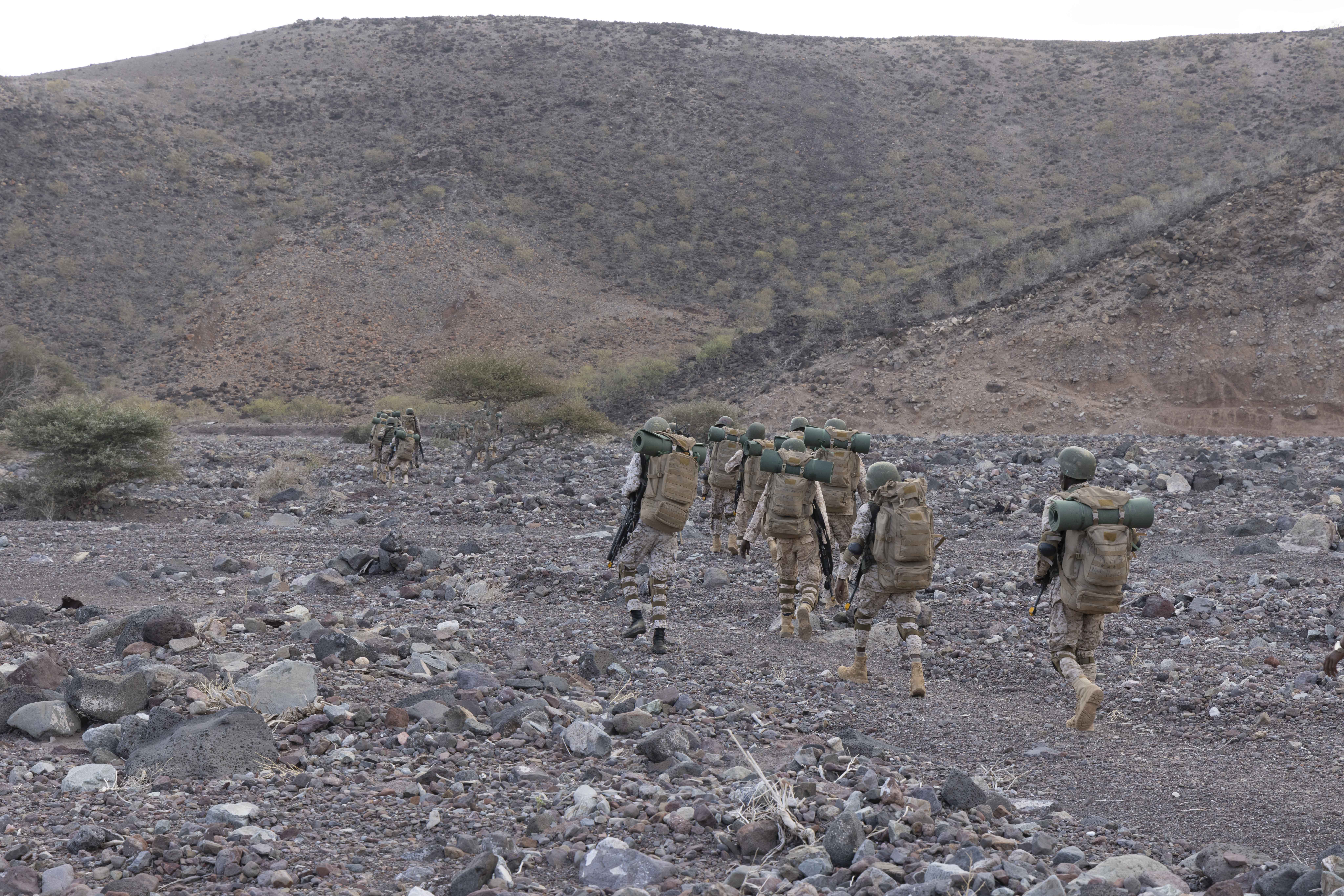 Djiboutian Battalion Intervention Rapide soldiers ruck to their firing positions during exercise Justified Accord 2025 at Arta Range Complex, Djibouti, Feb. 11, 2025. JA25 is the premier U.S. Africa Command (USAFRICOM) exercise in East Africa, designed to enhance multinational combat readiness, strengthen crisis response capabilities and empower allies and partners in the region. Led by U.S. Army Southern European Task Force, Africa (SETAF-AF) and hosted in Kenya, Djibouti and Tanzania, JA25 integrates high-intensity training scenarios that sharpen warfighting skills, increase operational reach and enhance the ability to execute complex joint and multinational operations. The exercise runs from Feb. 10–21, 2025. (U.S. Army photo by Cpl. Joey Ke)