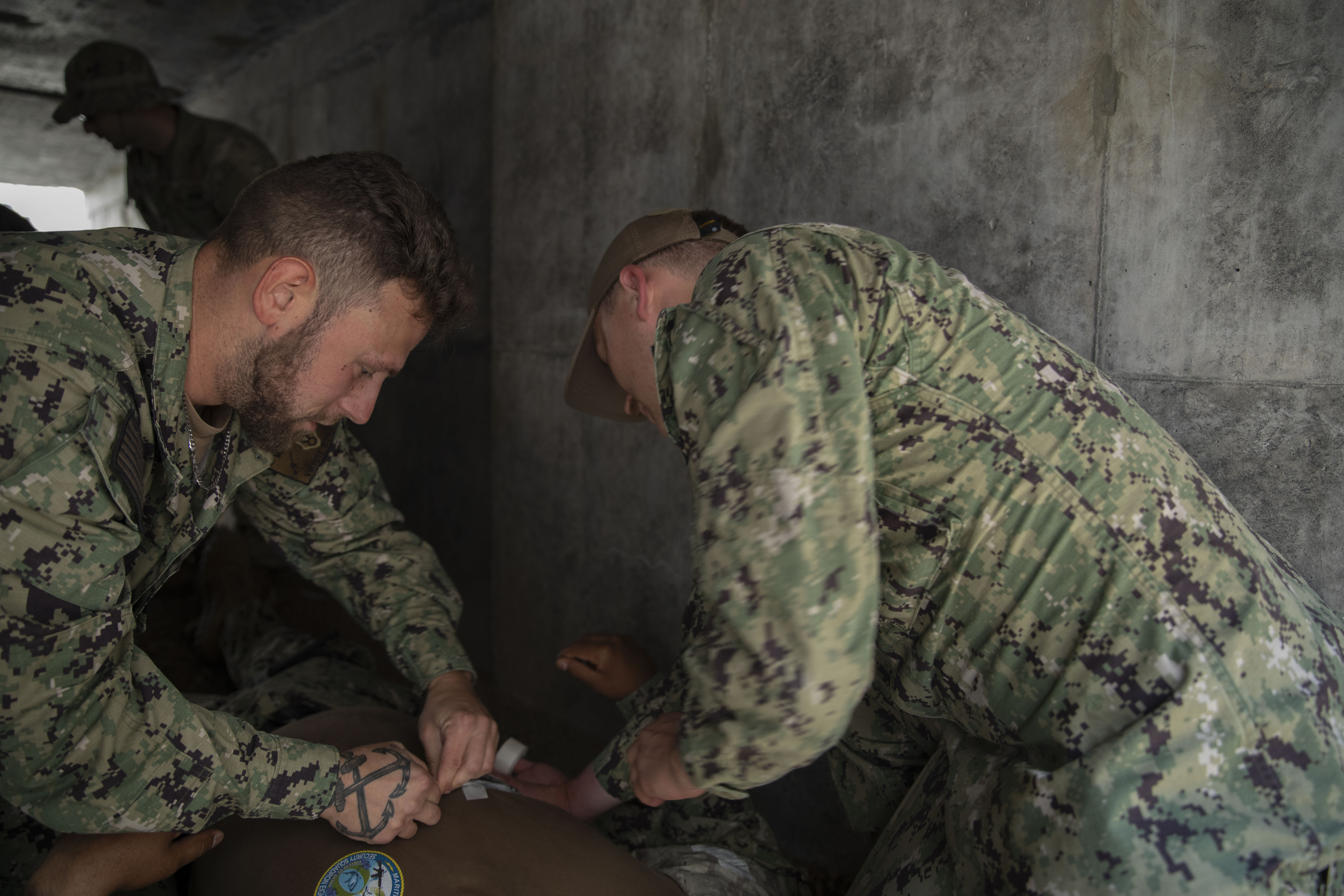 U.S. Navy Sailors practice their medical skills during a combat lifesavers course assessment hosted by Combined Joint Task Force – Horn of Africa at Camp Lemonnier, Djibouti, Feb. 21, 2025. The participants ran drills consisting of placing a nasopharyngeal airway, applying a tourniquet and assessing wounds. (U.S. Army photo by Spc. Micheala Maldonado)