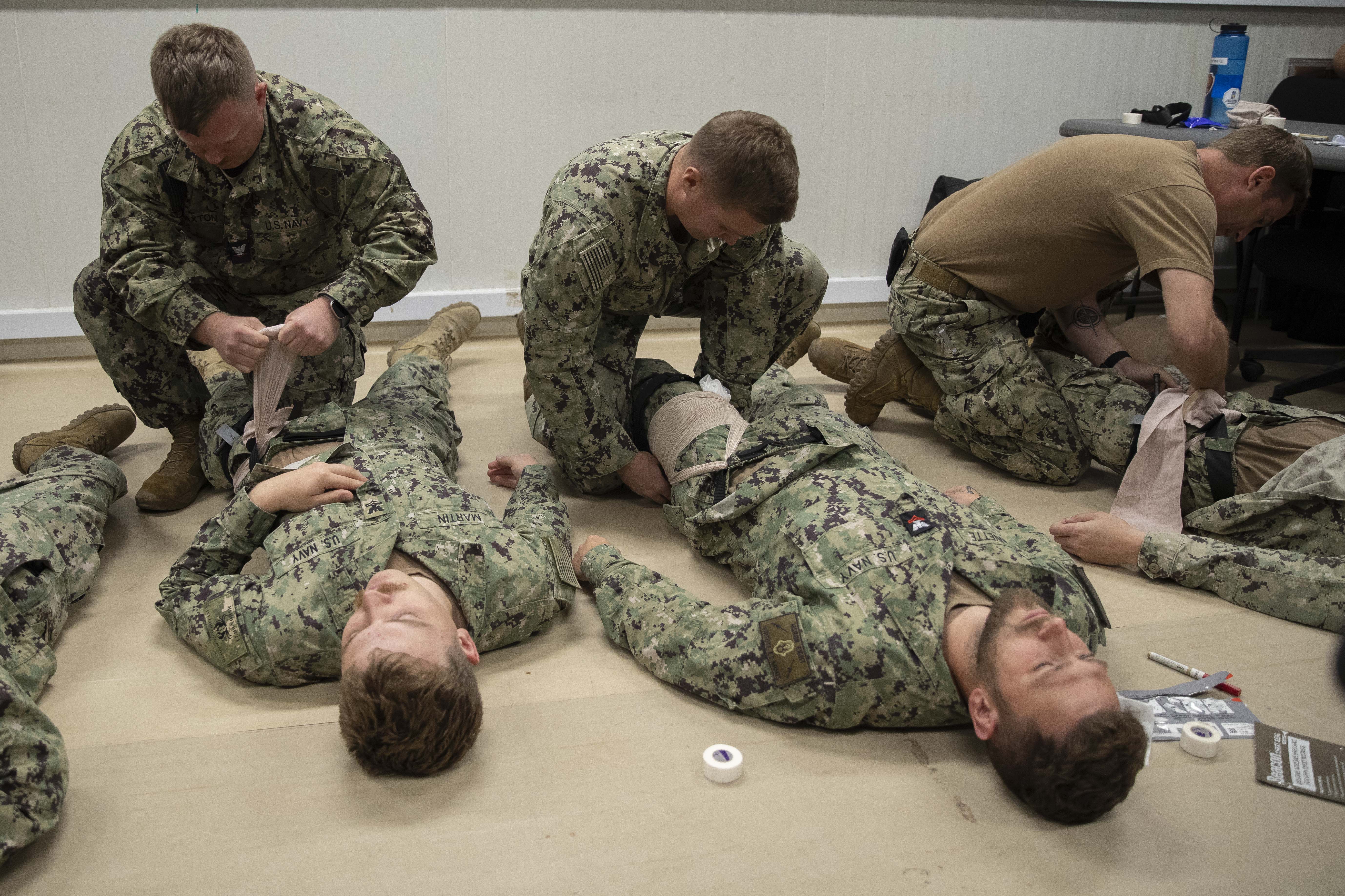 U.S. Navy Sailors practice bandaging a wound during a combat lifesavers course hosted by Combined Joint Task Force – Horn of Africa at Camp Lemonnier, Djibouti, Feb. 20, 2025. The course was designed to simulate a ship. They learned various techniques such as placing a chest decompression needle, packing a wound and wrapping it with medical bandages to control bleeding. (U.S. Army photo by Spc. Micheala Maldonado)