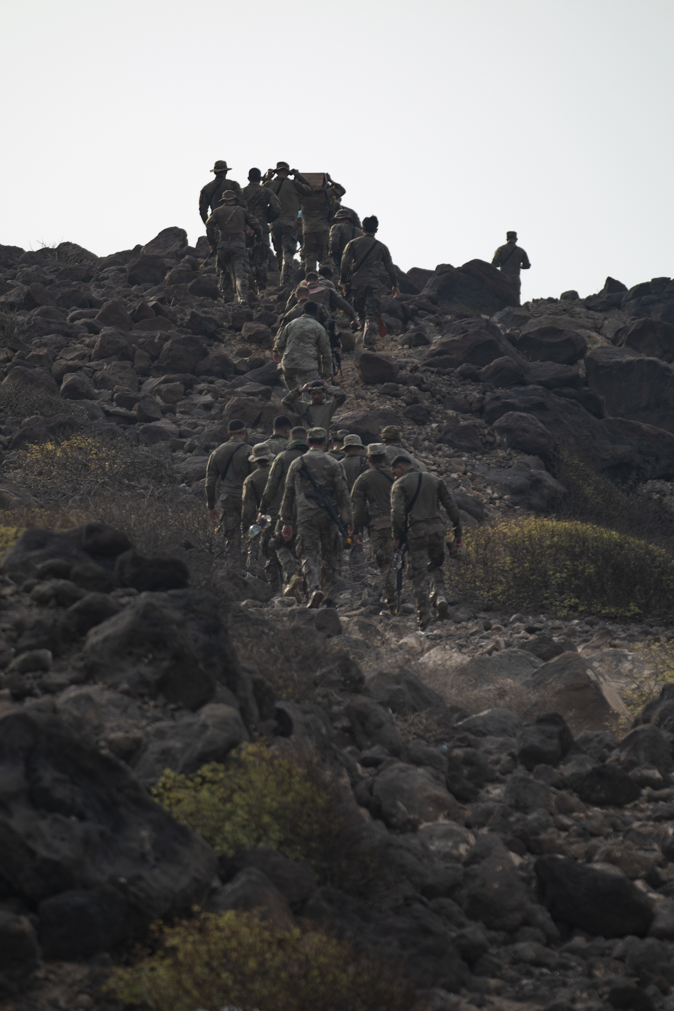 U.S. service members hike to the night survival portion of the French Desert Commando Course at the Combat Training Center, Arta Beach, Djibouti March 17, 2025. The night survival simulated a plane crash and tested how service members react and survive. (U.S. Army photo by Spc. Micheala Maldonado)