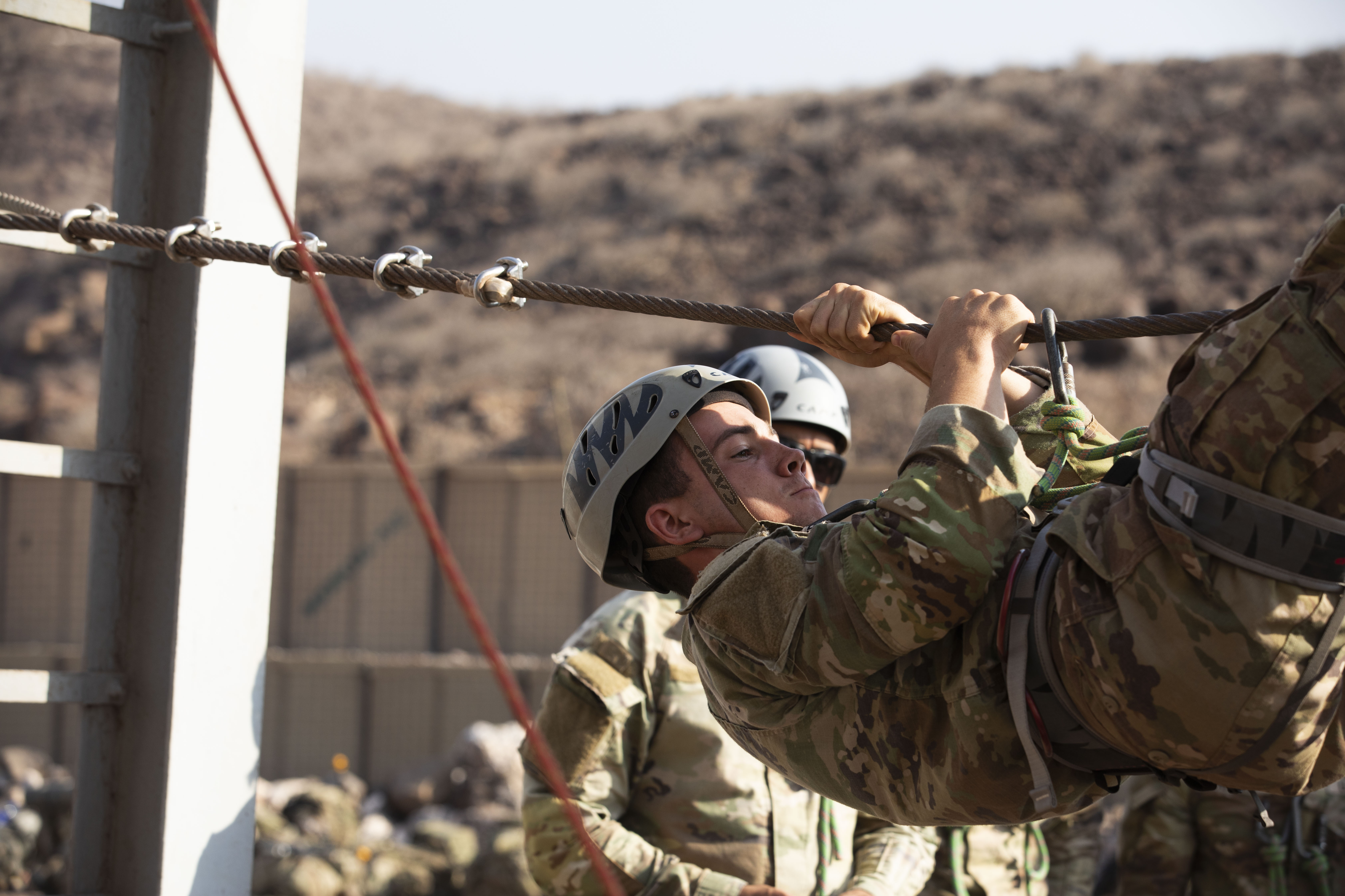 A U.S. service member practices proper recovery drills during a mountain course training for the French Desert Commando Course at the Combat Training Center, Arta Beach, Djibouti March 16, 2025. This year marked the ten-year anniversary with the U.S. participating in the French-led course. (U.S. Army photo by Spc Micheala Maldonado)