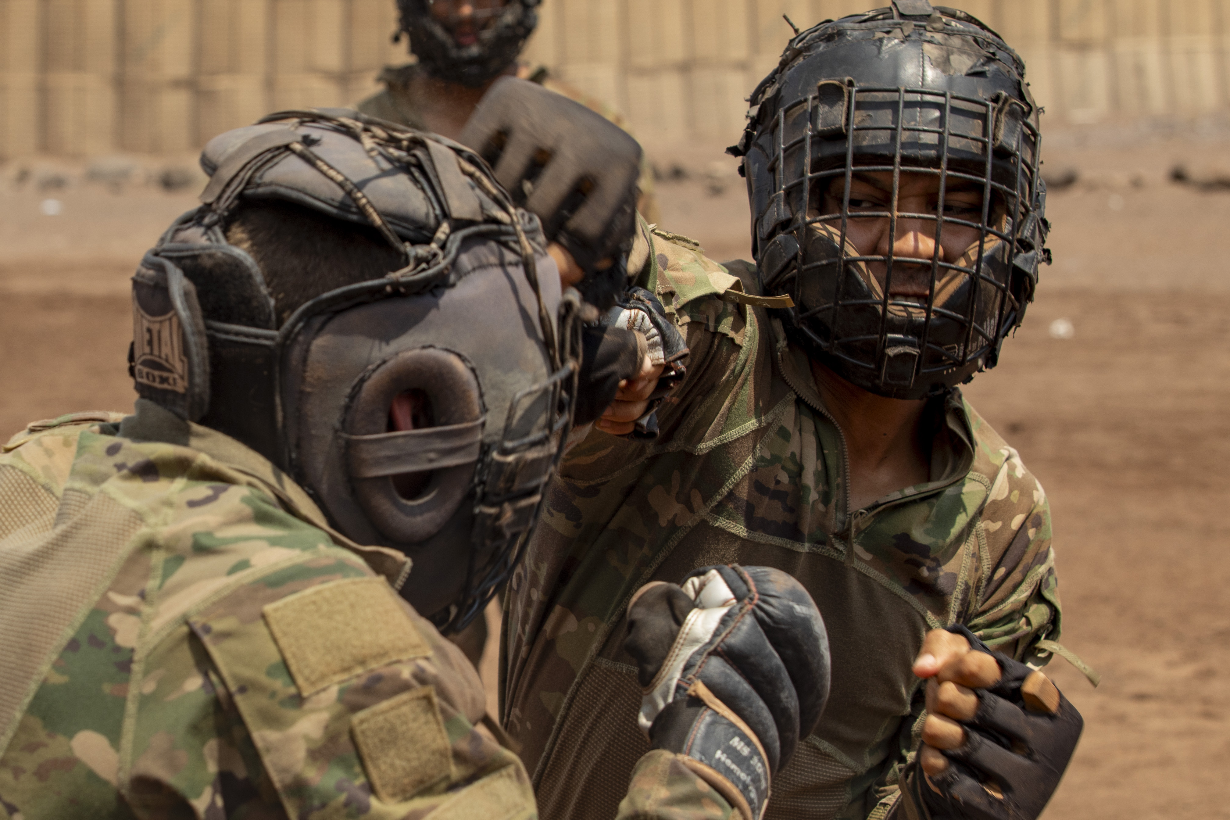 U.S. service members practice hand-to-hand combat during the French Desert Commando Course at the Combat Training Center, Arta Beach, Djibouti March 19, 2025. This training assisted service members in ensuring that they are always ready, lethal and prepared for any range of hand-to-hand combat scenarios. (U.S. Army photo by Spc. Micheala Maldonado)