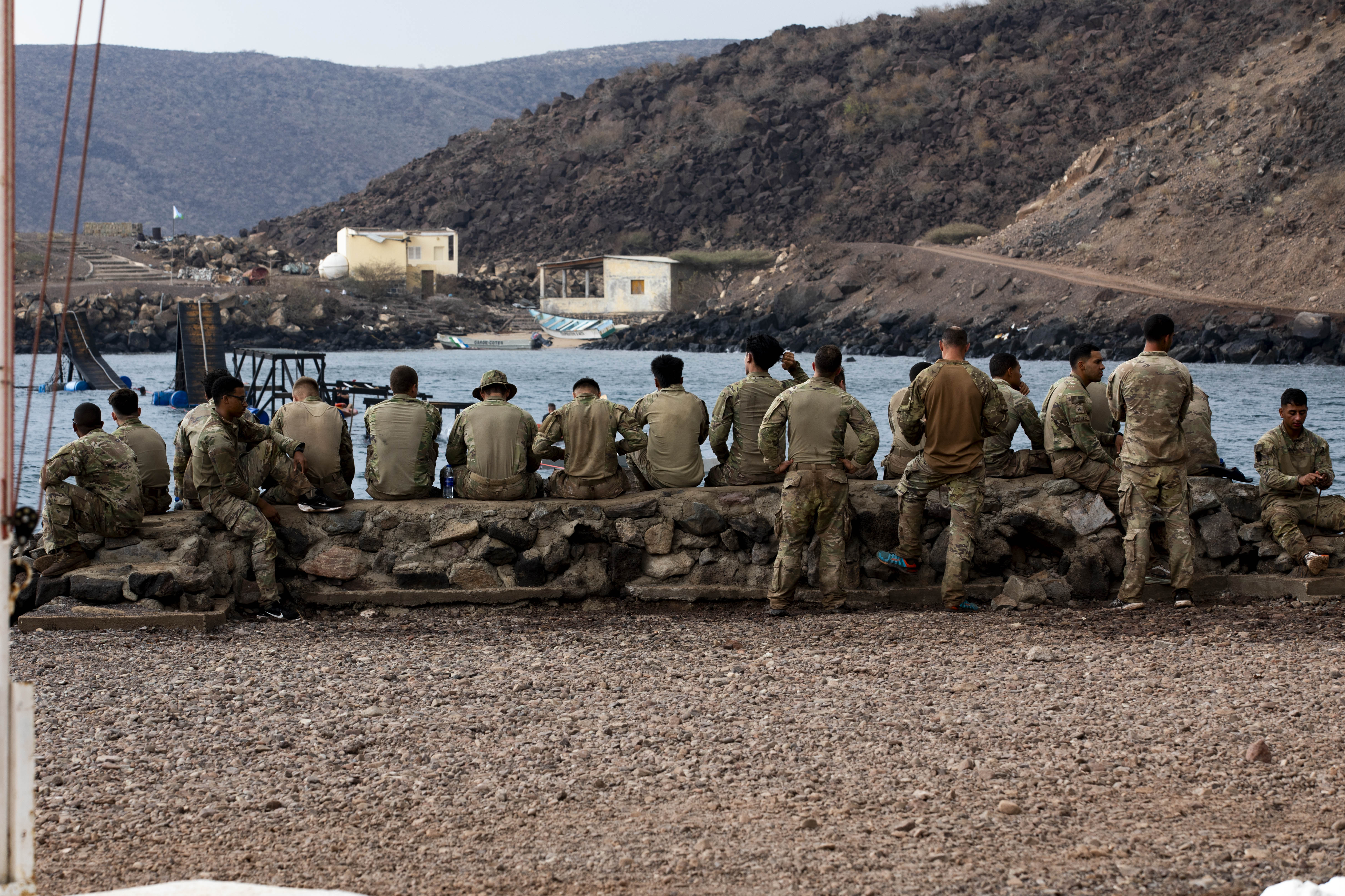 U.S. service members prepare for the individual water competition during the French Desert Commando Course at the Combat Training Center, Arta Beach, Djibouti March 18, 2025. Since 2015, the French Forces stationed in Djibouti have invited U.S. service members with the Combined Joint Task Force - Horn of Africa and Camp Lemonnier to participate in the course. (U.S. Army photo by Spc. Micheala Maldonado)