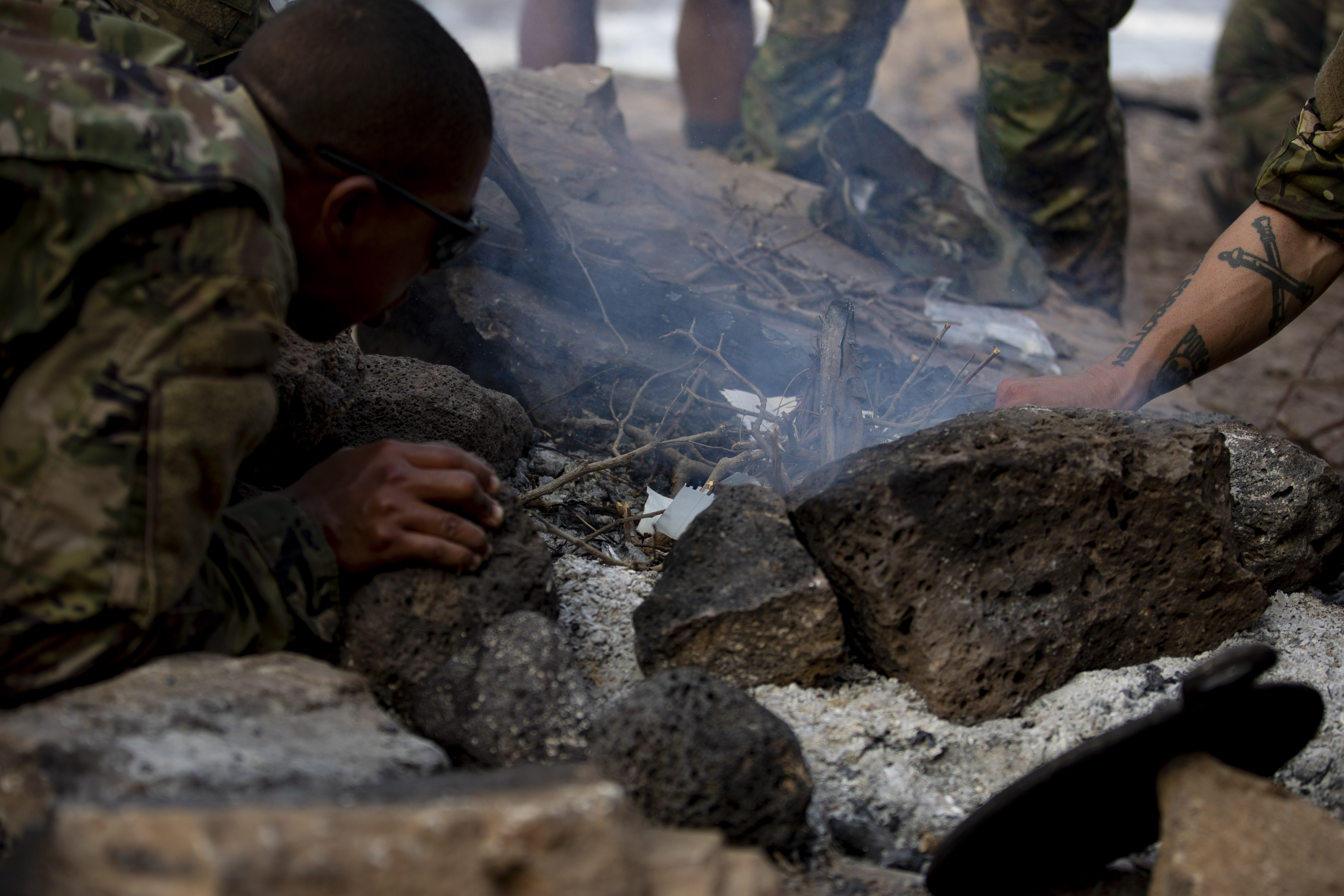 U.S. service members build a fire as they prepare the night survival portion of the French Desert Commando Course at the Combat Training Center, Arta Beach, Djibouti March 17, 2025. The night survival simulated a plane crash and tested how service members react and survive. (U.S. Army photo by Spc. Micheala Maldonado)
