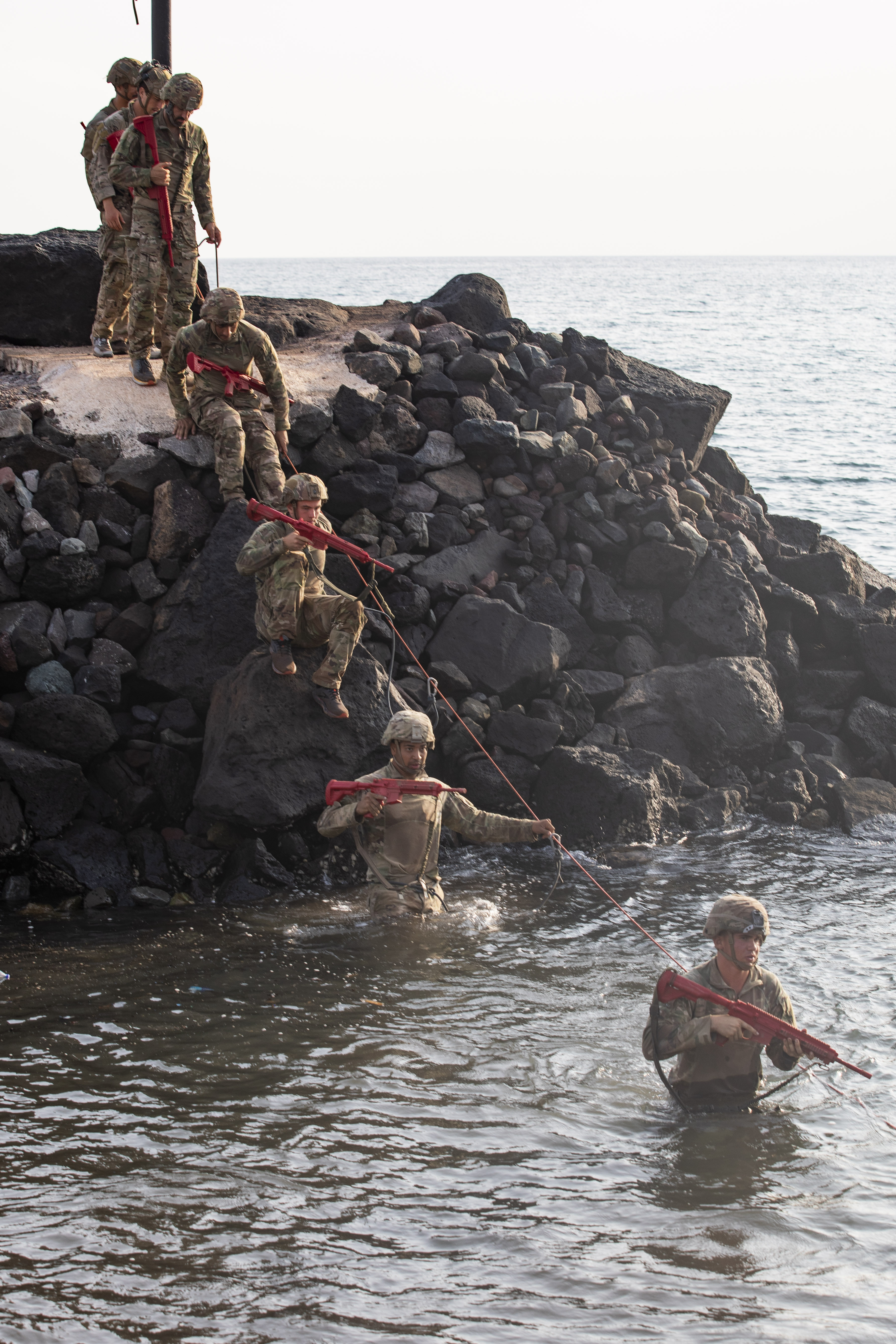 U.S. service members complete a tactical water crossing during the French Desert Commando Course at the Combat Training Center, Arta Beach, Djibouti March 19, 2025. Before crossing, the team had to send a simulated casualty across without getting the casualty wet. (U.S. Army photo by Spc. Micheala Maldonado)