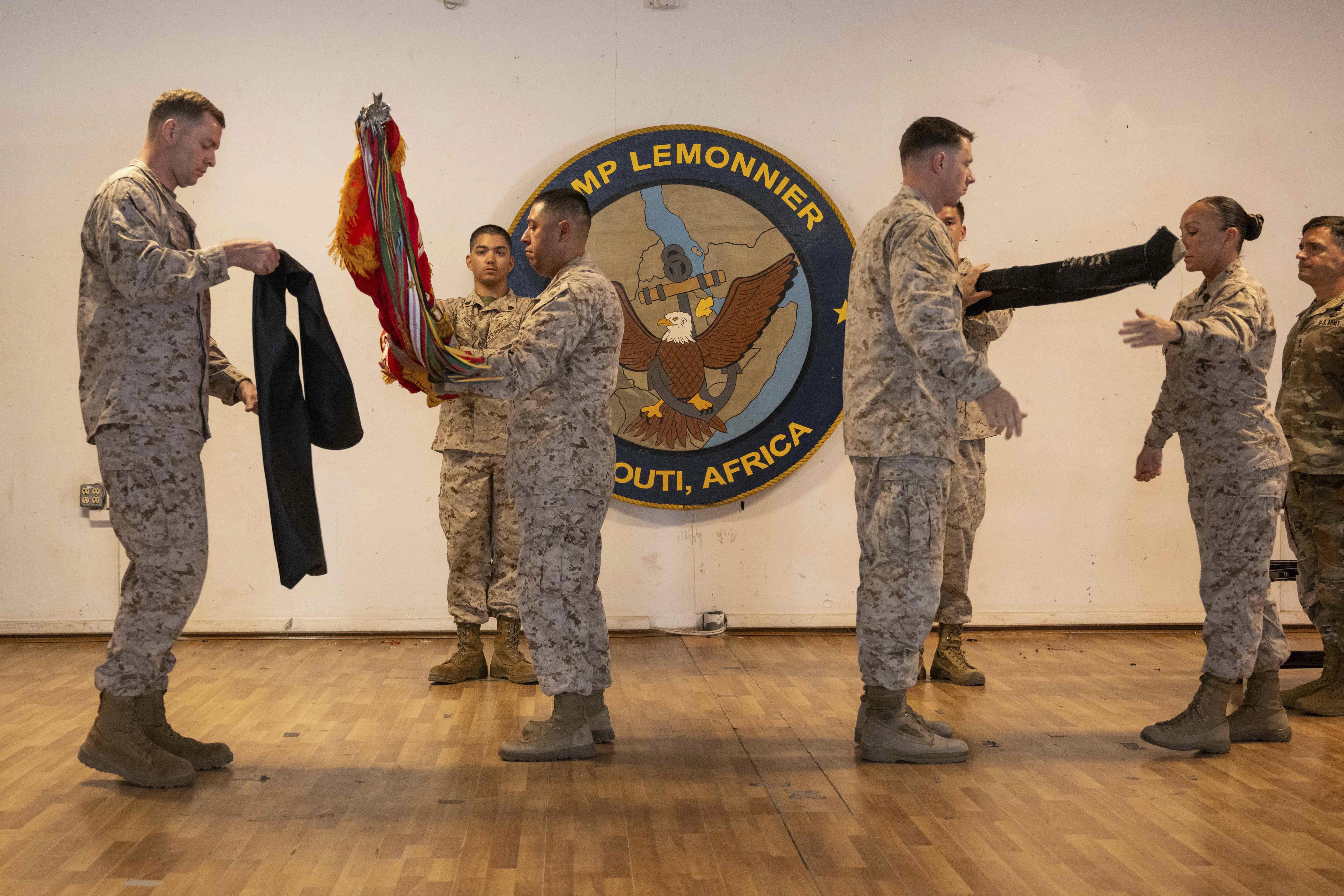 Leadership from Marine Medium Tiltrotor Squadron 266 and 161 assigned to Combined Joint Task Force - Horn of Africa Transfer Authority at Camp Lemonnier, Djibouti, Apr. 1, 2025. The ceremony is a military tradition representing a formal transfer of authority and responsibility for a mission from one unit to the next. (U.S. Navy photo by Mass Communicator 2nd Class Maurice Brown)